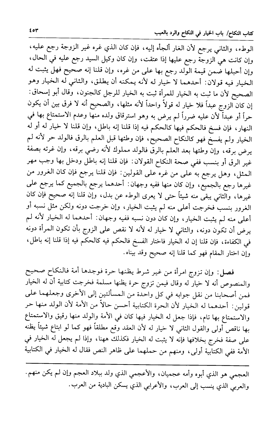 فصل: وإن تزوج امرأة من غير شرط يظنها حرة فوجدها أمة فالنكاح صحيح والمنصوص أنه لا خيار له وقال فيمن تزوج حرة يظنها مسلمة فخرجت كتابية أن له الخيار فمن أصحابنا من نقل جوابه في كل واحدة من المسألتين إلى الأخرى وجعلهما على قولين: أحدهما له الخيار لأن الحرة الكتابية أحسن حالاً من الأمة لأن الولد منها حر والاستمتاع بها تام فإذا جعل له الخيار فيها كان في الأمة والولد منها رقيق والاستمتاع بها ناقص أولى والقول الثاني لا خيار له لأن العقد وقع مطلقاً فهو كما لو ابتاع شيئاً يظنه على صفة فخرج بخلافها فإنه لا يثبت له الخيار فكذلك ههنا وإذا لم يجعل له الخيار في الأمة ففي الكتابية أولى ومنهم من حملها على ظاهر النص فقال له الخيار في الكتابية