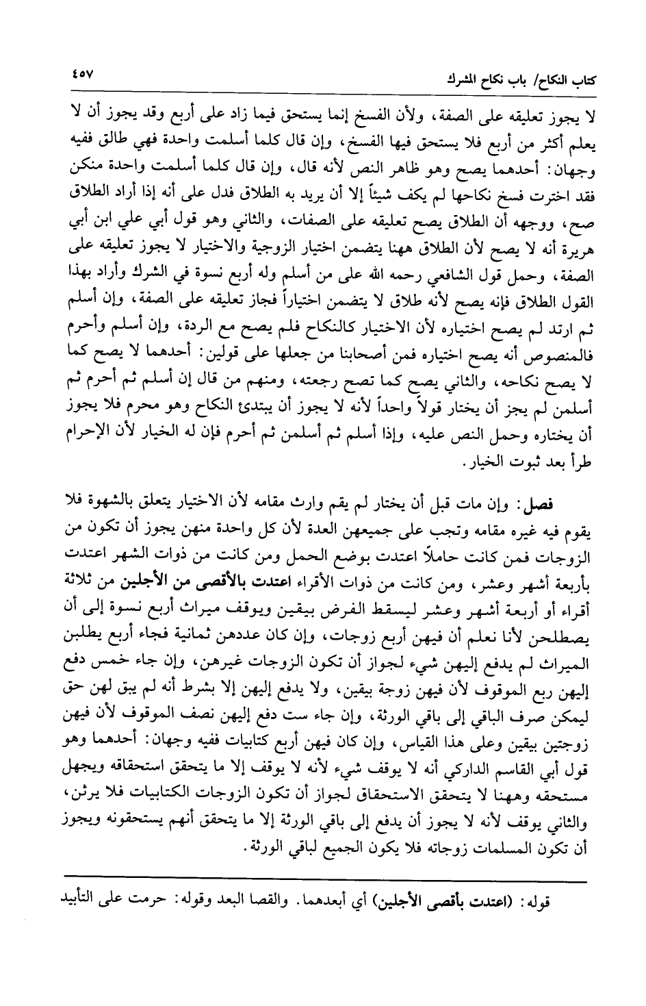 فصل: وإن مات قبل أن يختار لم يقم وارث مقامه لأن الاختيار يتعلق بالشهوة فلا يقوم فيه غيره مقامه وتجب على جميعهن العدة لأن كل واحدة منهن يجوز أن تكون من الزوجات فمن كانت حاملاً اعتدت بوضع الحمل ومن كانت من ذوات الشهر اعتدت بأربعة أشهر وعشر ومن كانت من ذوات الأقراء اعتدت بالأقصى من الأجلين من ثلاثة أقراء أو أربعة أشهر وعشر ليسقط الفرض بيقين ويوقف ميراث أربع نسوة إلى أن يصطلحن لأنا نعلم أن فيهن أربع زوجات وإن كان عددهن ثمانية فجاء أربع يطلبن الميراث لم يدفع إليهن شيء لجواز أن تكون الزوجات غيرهن وإن جاء خمس دفع إليهن ربع الموقوف لأن فيهن زوجة بيقين ولا يدفع إليهن إلا بشرط أنه لم يبق لهن حق ليمكن صرف الباقي إلى باقي الورثة وإن جاء ست دفع إليهن نصف الموقوف لأن فيهن زوجتين بيقين وعلى هذا القياس وإن كان فيهن أربع كتابيات ففيه وجهان: أحدهما وهو قول أبي القاسم الداركي أنه لا يوقف شيء لأنه لا يوقف إلا ما يتحقق استحقاقه ويجهل مستحقه وههنا لا يتحقق الاستحقاق لجواز أن تكون الزوجات الكتابيات فلا يرثن والثاني يوقف لأنه لا يجوز أن يدفع إلى باقي الورثة إلا ما يتحقق أنهم يستحقونه ويجوز أن تكون المسلمات زوجاته فلا يكون الجميع لباقي الورثة.