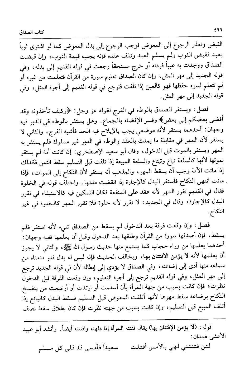 فصل: ويستقر الصداق بالوطء في الفرج لقوله عز وجل: {وَكَيْفَ تَأْخُذُونَهُ وَقَدْ أَفْضَى بَعْضُكُمْ إِلَى بَعْضٍ} وفسر الإفضاء بالجماع وهل يستقر بالوطء في الدبر فيه وجهان: أحدهما يستقر لأنه موضعي يجب بالإيلاح فيه الحد فأشبه الفرج والثاني لا يستقر لأن المهر في مقابلة ما يملك بالعقد والوطء في الدبر غير مملوك فلم يستقر به المهر ويستقر بالموت قبل الدخول وقال أبو سعيد الإصطخري: إن كانت أمة لا يستقر بموتها لأنها كالسلعة تباع وتبتاع والسلعة المبيعة إذا تلفت قبل التسليم سقط الثمن فكذلك إذا ماتت الأمة وجب أن يسقط المهر والمذهب أن يستقر لأن النكاح إلى الموات فإذا ماتت انتهى النكاح فاستقر البدل كالإجارة إذا انقضت مدتها واختلف قوله في الخلوة فقال في القديم تقرر المهر لأنه عقد على المنفعة فكان التمكين فيه كالاستيفاء في تقرر البدل كالإجارة وقال في الجديد: لا تقرر لأنها خلوة فلا تقرر المهر كالخلوة في غير النكاح.