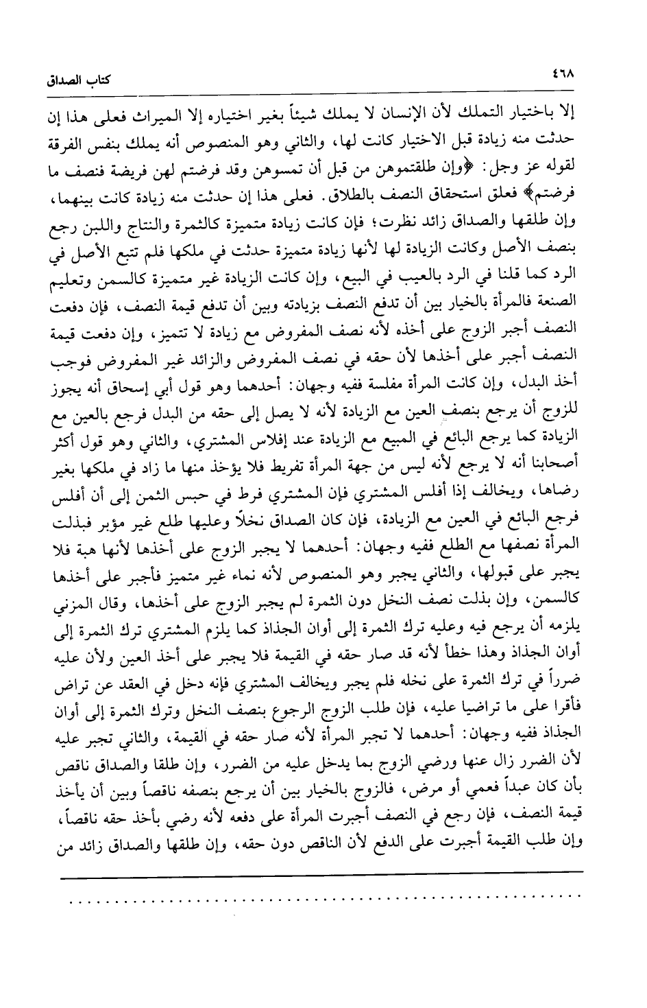 إلا باختيار التملك لأن الإنسان لا يملك شيئاً بغير اختياره إلا الميراث فعلى هذا إن حدثت منه زيادة قبل الاختيار كانت لها الثاني وهو المنصوص أنه يملك بنفس الفرقة لقوله عز وجل: {وَإِنْ طَلَّقْتُمُوهُنَّ مِنْ قَبْلِ أَنْ تَمَسُّوهُنَّ وَقَدْ فَرَضْتُمْ لَهُنَّ فَرِيضَةً فَنِصْفُ مَا فَرَضْتُمْ} فعلق استحقاق النصف بالطلاق فعلى هذا إن حدثت منه زيادة كانت بينهما وإن طلقها والصداق زائد نظرت فإن كانت زيادة متميزة كالثمرة والنتاج واللبن رجع بنصف الأصل وكانت الزيادة لها لأنها زيادة متميزة حدثت في ملكها فلم تتبع الأصل في الرد كما قلنا في الرد بالعيب في البيع وإن كانت الزيادة غير متميزة كالسمن وتعليم الصنعة فالمرأة بالخيار بين أن تدفع النصف بزيادته وبين أن تدفع قيمة النصف فإن دفعت النصف أجبر الزوج على أخذه لأنه نصف المفروض مع زيادة لا تتميز وإن دفعت قيمة النصف أجبر على أخذها لأن حقه في نصف المفروض والزائد غير المفروض فوجب أخذ البدل وإن كانت المرأة مفلسة ففيه وجهان: أحدهما وهو قول أبي إسحاق أنه يجوز للزوج أن يرجع بنصف العين مع الزيادة لأنه لا يصل إلى حقه من البدل فرجع بالعين مع الزيادة كما يرجع البائع في المبيع مع الزيادة عند إفلاس المشتري والثاني وهو قول أكثر أصحابنا أنه لا يرجع لأنه ليس من جهة المرأة تفريط فلا يؤخذ منها ما زاد في ملكها بغير رضاها ويخالف إذا أفلس المشتري فإن المشتري فرط في حبس الثمن إلى إن أفلس فرجع البائع في العين مع الزيادة فإن كان الصداق نخلاً وعليها طلع غير مؤبر فبذلت المرأة نصفها مع الطلع ففيه وجهان: أحدهما لا يجبر الزوج على أخذها لأنها هبة فلا يجبر على قبولها والثاني يجبر وهو المنصوص لأنه نماء غير متميز فأجبر على أخذها كالسمن وإن بذلت نصف النخل دون الثمرة لم يجبر الزوج على أخذها وقال المزني يلزمنه أن يرجع فيه وعليه ترك الثمرة إلى أوان الجذاذ كما يلزم المشتري ترك الثمرة إلى أوان الجذاذ وهذا خطأ لأنه قد صار حقه في القيمة فلا يجبر على أخذ العين ولأن عليه ضرراً في ترك الثمرة على نخله فلم يجبر ويخالف المشتري فإن دخل في العقد عن تراض فأقرا على ما تراضيا عليه فإن طلب الزوج الرجوع بنصف النخل وترك الثمرة إلى أوان الجذاذ ففيه وجهان: أحدهما لا تجبر المرأة لأنه صار حقه في القيمة والثاني تجبر عليه لأن الضرر زال عنها ورضي الزوج بما يدخل عليه من الضرر وإن طلقا والصداق ناقص بأن كان عبداً فعمي أو مرض فالزوج بالخيار بين أن يرجع بنصفه ناقصاً وبين أن يأخذ قيمة النصف فإن رجع في النصف أجبرت المرأة على دفعه لأنه رضي بأخذ حقه ناقصاً وإن طلب القيمة أجبرت على الدفع لأن الناقص دون حقه وإن طلقها والصداق زائد من