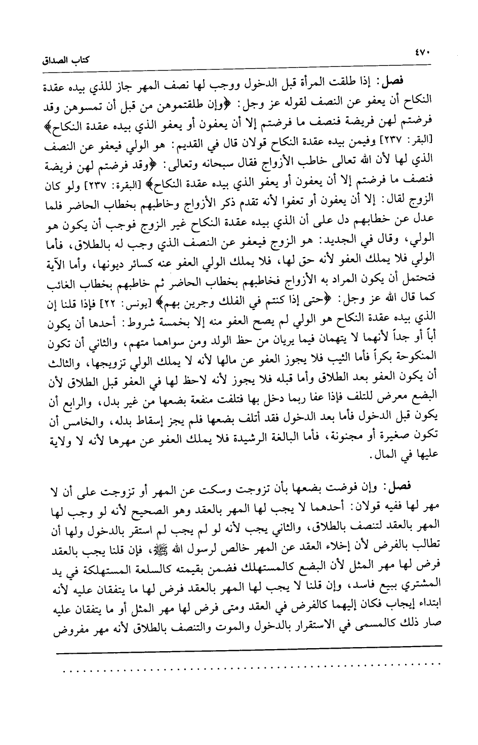 فصل: إذا طلقت المرأة قبل الدخول ووجب لها نصف المهر جاز للذي بيده عقدة النكاح أن يعفو عن النصف لقوله عز وجل: {وَإِنْ طَلَّقْتُمُوهُنَّ مِنْ قَبْلِ أَنْ تَمَسُّوهُنَّ وَقَدْ فَرَضْتُمْ لَهُنَّ فَرِيضَةً فَنِصْفُ مَا فَرَضْتُمْ إِلَّا أَنْ يَعْفُونَ أَوْ يَعْفُوَ الَّذِي بِيَدِهِ عُقْدَةُ النِّكَاحِ} [البقرة: 237] وفيمن بيده عقد النكاح قولان قال في القديم: هو الولي فيعفو عن النصف الذي لها لأن الله تعالى خاطب الأزواج فقال سبحانه وتعالى: {وَقَدْ فَرَضْتُمْ لَهُنَّ فَرِيضَةً فَنِصْفُ مَا فَرَضْتُمْ إِلَّا أَنْ يَعْفُونَ أَوْ يَعْفُوَ الَّذِي بِيَدِهِ عُقْدَةُ النِّكَاحِ} [البقرة: 237] ولو كان الزوج لقال: إلا أن يعفون أو تعفو لأنه تقدم ذكر الأزواج وخاطبهم بخطاب الحاضر فلما عدل عن خطابهم دل على أن الذي بيده عقدة النكاح غير الزوج فوجب أن يكون هو الولي وقال في الجديد: هو الزوج فيعفو عن النصف الذي وجب له بالطلاق فأما الولي فلا يملك العفو لأنه حق لها فلا يمللك العفو عنه كسائر ديونها وأما الآية فتحتمل أن يكون المراد به هو الأزواج فخاطبهم بخطاب الحاضر ثم خاطبهم بخطاب الغائب كما قال الله عز وجل: {حَتَّى إِذَا كُنْتُمْ فِي الْفُلْكِ وَجَرَيْنَ بِهِمْ} [يونس: 22] فإذا قلنا إن الذي بيده عقدة النكاح هو الولي لم يصح العفو منه إلا بخمسة شروط: أحدهما أن يكون أباً أو جداً لأنهما لا يتهمان فيما يريان من حظ الولد ومن سواهما متهم والثاني أن تكون المنكوحة بكراً فأما الثيب لا يجوز العفو عن مالها لأنه لا يملك الولي تزويجها والثالث أن يكون العفو بعد الطلاق وأما قبله فلا يجوز لأنه لا حظ لها في العفو قبل الطلاق لأن البضع معرض للتلف فإذا عفا ربما دخل بها فتلفت منفعة بضعها من غير بدل والرابع أن يكون قبل الدخول فأما بعد الدخول فقد أتلف بضعها فلم يجز إسقاط بدله والخامس أن تكون صغيرة أو مجنونة فأما البالغة الرشيدة فلا يملك العفو عن مهرها لأنه لا ولاية عليها في المال.