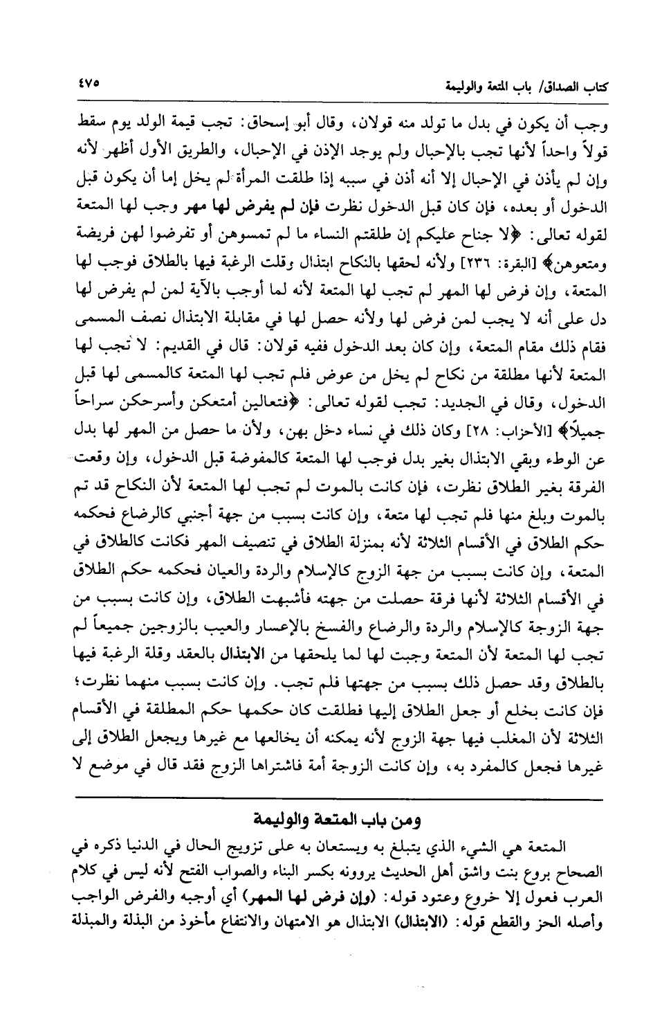 وجب أن يكون في بدل ما تولد منه قولان وقال أبو إسحاق: تجب قيمة الولد يوم سقط قولاً واحداً لأنها تجب بالإحبال ولم يوجد الإذن في الإحبال والطريق الأول أظهر لأنه وإن لم يأذن في الإحبال إلا أنه أذن في سببه إذا طلقت المرأة لم يخل إما أن يكون قبل الدخول أو بعده فإن كان قبل الدخول نظرت فإن لم يفرض لها مهر وجب لها المتعة لقوله تعالى: {لَا جُنَاحَ عَلَيْكُمْ إِنْ طَلَّقْتُمُ النِّسَاءَ مَا لَمْ تَمَسُّوهُنَّ أَوْ تَفْرِضُوا لَهُنَّ فَرِيضَةً وَمَتِّعُوهُنَّ} [البقرة: 236] ولأنه لحقها بالنكاح ابتذال وقلت الرغبة فيها بالطلاق فوجب لها المتعة وإن فرض لها المهر لم تجب لها المتعة لأنه لما أوجب بالآية لمن لم يفرض لها دل على أنه لا يجب لمن فرض لها ولأنه حصل لها في مقابلة الابتذال نصف المسمى فقام ذلك مقام المتعة وإن كان بعد الدخول ففيه قولان: قال في القديم: لا تجب لها المتعة لأنها مطلقة من نكاح لم يخل من عوض فلم تجب لها المتعة كالمسمى لها قبل الدخول وقال في الجديد: تجب لقوله تعالى: {فَتَعَالَيْنَ أُمَتِّعْكُنَّ وَأُسَرِّحْكُنَّ سَرَاحاً جَمِيلاً} [الأحزاب: 28] وكان ذلك في نساء دخل بهن ولأن ما حصل من المهر لها بدل عن الوطء وبقي الابتذال بغير بدل فوجب لها المتعة كالمفوضة قبل الدخول وإن وقعت الفرقة بغير الطلاق نظرت فإن كانت بالموت لم تجب لها المتعة لأن النكاح قد تم بالموت وبلغ منها فلم تجب لها متعة وإن كانت بسبب من جهة أجنبي كالرضاع فحكمه حكم الطلاق في الأقسام الثلاثة لأنه بمنزلة الطلاق في تصنيف المهر فكانت كالطلاق في المتعة وإن كانت بسبب من جهة الزوج كالإسلام والردة والعيان فحكمه حكم الطلاق في الأقسام الثلاثة لأنها فرقة حصلت من جهته فأشبهت الطلاق وإن كانت بسبب من جهة الزوجة كالإسلام والردة والرضاع والفسخ بالإعسار والعيب بالزوجين جميعاً لم تجب لها المتعة لأن المتعة وجت لها لما يلحقها من الابتذال بالعقد وقلة الرغبة فيها بالطلاق وقد حصل ذلك بسبب من جهتها فلم تجب وإن كانت بسبب منها نظرت فإن كانت بخلع أو جعل الطلاق إليها فطلقت كان حكمها حكم المطلقة في الأقسام الثلاثة لأن المغلب فيها جهة الزوج لأنه يمكنه أن يخالعها مع غيرها ويجعل الطلاق إلى غيرها فجعل كالمفرد به وإن كانت الزوجة أمة فاشتراها الزوج فقد قال في موضع لا