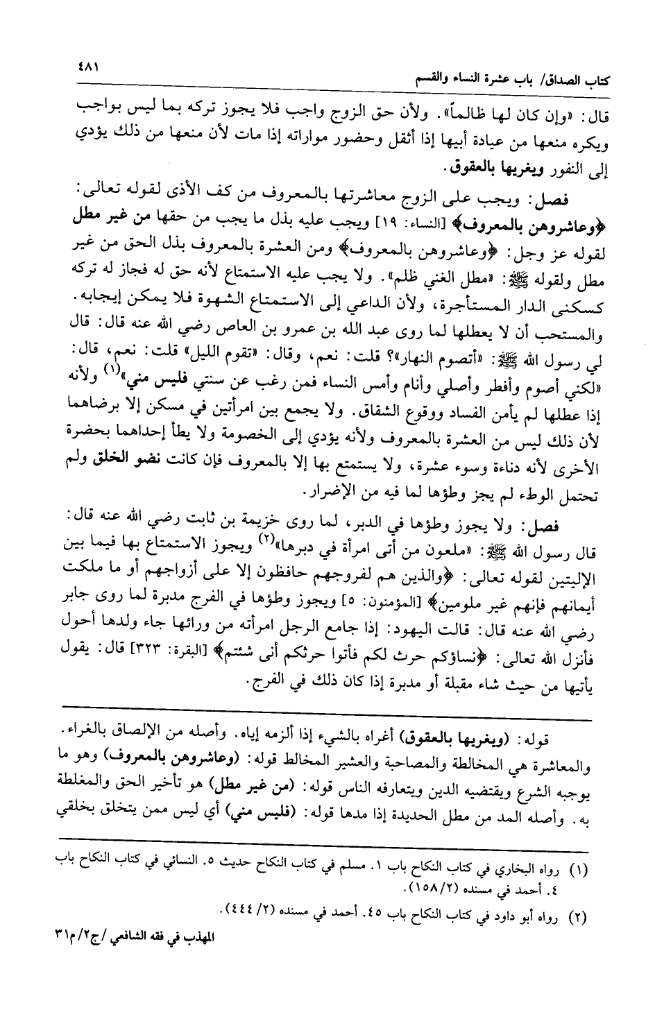 فصل: ويجب على الزوج معاشرتها بالمعروف مع كف الأذى لقوله تعالى: {وَعَاشِرُوهُنَّ بِالْمَعْرُوفِ} [النساء: 19] ويجب عليه بذل ما يجب من حقها من غير مطل لقوله عز وجل: {وَعَاشِرُوهُنَّ بِالْمَعْرُوفِ} ومن العشرة بالمعروف بذل الحق من غير مطل ولقوله صلى الله عليه وسلم: "مطل الغني ظلم" ولا يجب عليه الاستمتاع لأنه حق له فجاز تركه كسكنى الدار المستأجرة ولأن الداعي إلى الاستمتاع الشهوة فلا يمكن إيجابه والمستحب أن لا يعطلها لما روى عبد الله بن عمر بن العاص رضي الله عنه قال: قال لي رسول الله صلى الله عليه وسلم: "أتصوم النهار؟ " قلت: نعم وقال: "تقوم الليل" قلت: نعم قال: "لكني أصوم وأفطر وأصلي وأنام وأمس النساء فمن رغب عن سنتي فليس مني1" ولأنه إذا عطلها لا يأمن الفساد ووقوع الشقاق ولا يجمع بين امرأتين في مسكن إلا برضاهما لأن ذلك ليس من العشرة بالمعروف ولأنه يؤدي إلى الخصومة ولا يطأ إحداهما بحضرة الأخرى لأنه دناءة وسوء عشرة ولا يستمتع بها إلا بالمعروف فإن كانت نضو الخلق ولم تحتمل الوطء لم يجز وطؤها لما فيه من الأضرار.