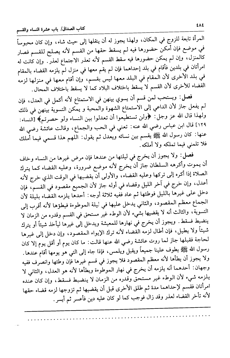 فصل: ولا يجوز أن يخرج في ليلتها من عندها فإن مرض غيرها من النساء وخاف أن يموت وأكرهه السلطان جاز أن يخرج لأنه موضع ضرورة وعليه القضاء كما يترك الصلاة إذا أكره إلى تركها وعليه القضاء والأولى أن يقضيها في الوقت الذي خرج لأنه أعدل وإن خرج في آخر الليل وقضاه في أوله جاز لأن الجميع مقصود في القسم فإن دخل على غيرها بالليل فوطئها ثم عاد ففيه ثلاثة أوجه: أحدها يلزمه القضاء بليلة لأن الجماع معظم المقصود والثاني يدخل عليها في ليلة الموطوءة فيطؤها لأنه أقرب إلى التسوية والثالث أنه لا يقضيها بشيء لأن الوطء غير مستحق في القسم وقدره من الزمان لا ينضبط فسقط ويجوز أن يخرج في نهارها للمعيشة ويدخل إلى غيرها ليأخذ شيئاً أو يترك شيئاً ولا يطيل فإن أطال لزمه القضاء لأنه ترك الإيواء المقصود وإن دخل إلى غيرها في حاجه فقبلها جاز لما روت عائشة رضي الله عنها قالت: ما كان يوم أو أقل يوم إلا كان رسول الله صلى الله عليه وسلم يطوف علينا جميعاً ويقبل ويلمس فإذا جاء إلى التي هو يومها أقام عندها ولا يجوز أن يطأها لأنه معظم المقصود فلا يجوز في قسم غيرها فإن وطئها وانصرف ففيه وجهان: أحدهما أنه يلزمه أن يخرج في نهار الموطوءة ويطأها لأنه هو العدل والثاني لا يلزمه شيء لأن الوطء غير مستحق وقدره من الزمان لا ينضبط فسقط وإن كان عنده امرأتان فقسم لإحداهما مدة ثم طلق الأخرى قبل أن يقضيها ثم تزوجها لزمه قضاء حقه لأنه حق تأخر القضاء لعذر وقد زال فوجب كما لو كان عليه دين فأعسر ثم أيسر.