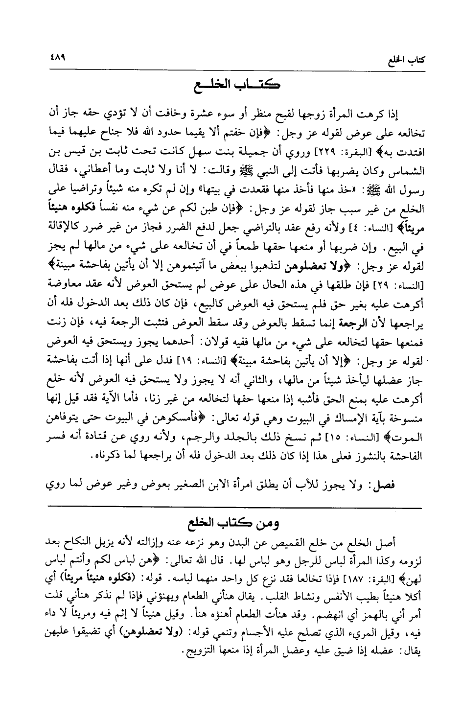 إذا كرهت المرأة زوجها لقبح منظر أو سوء عشرة وخافت أن لا تؤدي حقه جاز أن تخالعه على عوض لقوله عز وجل: {فَإِنْ خِفْتُمْ أَلَّا يُقِيمَا حُدُودَ اللَّهِ فَلا جُنَاحَ عَلَيْهِمَا فِيمَا افْتَدَتْ بِهِ} [البقرة: 229] وروي أن جميلة بنت سهل كانت تحث ثابت بن قيس بن الشماس وكان يضربها فأتت إلى النبي صلى الله عليه وسلم وقالت: لا أنا ولا ثابت وما أعطاني فقال رسول الله صلى الله عليه وسلم: "خذ منها فأخذ منها فقعدت في بيتها" وإن لم تكره منه شيئاً وتراضيا على الخلع من غير سبب جاز لقوله عز وجل: {فَإِنْ طِبْنَ لَكُمْ عَنْ شَيْءٍ مِنْهُ نَفْساً فَكُلُوهُ هَنِيئاً مَرِيئاً} [النساء: 4] ولأنه رفع عقد بالتراضي جعل لدفع الضرر فجاز من غير ضرر كالإقالة في البيع وإن ضربها أو منعها حقها طمعاً في أن تخالعه على شيء من مالها لم يجز لقوله عز وجل: {وَلا تَعْضُلُوهُنَّ لِتَذْهَبُوا بِبَعْضِ مَا آتَيْتُمُوهُنَّ إِلَّا أَنْ يَأْتِينَ بِفَاحِشَةٍ مُبَيِّنَةٍ} [النساء: 29] فإن طلقها في هذه الحال على عوض لم يستحق العوض لأنه عقد معاوضة أكرهت عليه بغير حق فلم يستحق فيه العوض كالبيع فإن كان ذلك بعد الدخول فله أن يراجعها لأن الرجعة إنما تسقط بالعوض وقد سقط العوض فتثبت الرجعة فيه فإذا زنت لقوله عز وجل: {إِلَّا أَنْ يَأْتِينَ بِفَاحِشَةٍ مُبَيِّنَةٍ} [النساء: 19] فدل على أنها إذا أتت بفاحشة جاز عضلها ليأخذ شيء من مالها والثاني أنه لا يجوز ولا يستحق فيه العوض لأنه خلع أكرهت عليه بمنع الحق فأشبه إذا منعها حقها لتخالعه من غير زنا فأما الآية فقد قيل إنها منسوخة بآية الإمساك في البيوت وهي قوله تعالى: {فَأَمْسِكُوهُنَّ فِي الْبُيُوتِ حَتَّى يَتَوَفَّاهُنَّ الْمَوْتُ} [النساء: 15] ثم نسخ ذلك بالجلد والرجم ولأنه روي عن قتاده أنه فسر الفاحشة بالنشوز فعلى هذا إذا كان ذلك بعد الدخول فله أن يراجعها لما ذكرناه.