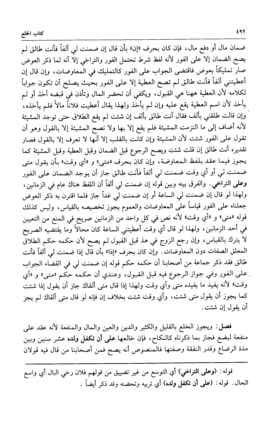 ضمان مال أو دفع مال فإن كان بحرف "إن" بأن قال إن ضمنت لي ألفاً فأنت طالق لم يصح الضمان إلا على الفور لأنه لفظ شرط تحتمل الفور والتراخي إلا أنه لما ذكر العوض صار تمليكاً بعوض فاقتضى الجواب على الفور كالتمليك في المعاوضات وإن قال إن أعطيتني ألفاً فأنت طالق لم تصح العطية إلى على الفور بحيث يصلح أن تكون جواباً لكلامه لأن العطية ههنا هي القبول ويكفي أن تحضر المال وتأذن في قبضه أخذ أو لم يأخذ لأن اسم العطية يقع عليه وإن لم يأخذ ولهذا يقال أعطيت فلاناً مالاً فلم يأخذه وإن قالت طلقني بألف فقال أنت طالق بألف إن شئت لم يقع الطلاق حتى توجد المشيئة لأنه أضاف إلى ما التزمت المشيئة فلم يقع إلى بها ولا تصح المشيئة إلا بالقول وهو أن تقول على الفور شئت لأن المشيئة وإن كانت بالقلب فإنها لا تعرف إلا بالقول فصار تقديره أنت طالق إن قلت شئت ويصح الرجوع قبل الضمان وقبل العطية وقبل المشيئة كما يجوز فيما عقد بلفظ المعاوضة وإن كان بحرف (متى) و (أي وقت) بأن يقول متى ضمنت لي أو أي وقت ضمنت لأي ألفاً فأنت طالق جاز أن يوجد الضمان على الفور وعلى التراخي والفرق بينه وبين قوله إن ضمنت لي ألفاً أن اللفظ هناك عام في الزمانين ولهذا لو قال إن ضمنت لي الساعة أو إن ضمنت لي غداً جاز فلما اقترن به ذكر العوض جعلناه على الفور قياساً على المعاوضات والعموم يجوز تخصيصه بالقياس وليس كذلك قوله (متى) و (أي وقت) لأنه نص في كل واحد من الزمانين صريح في المنع من التعيين في أحد الزمانين ولهذا لو قال أي وقت أعطيتني الساعة كان محالاً وما يقتضيه الصريح لا يترك بالقياس وإن رجع الزوج في هذا قبل القبول لم يصح لأن حكمه حكم الطلاق المعلق الصفات دون المعاوضات وإن كان بحرف (إذا) بأن قال إذا ضمنت لي ألفاً فأنت طالق فقد ذكر جماعة من أصحابنا أحكمه حكم قوله إن ضمنت لي في القضاء الجواب على الفور وفي جواز الرجوع فيه قبل القبول وعندي أن حكمه حكم (متى) و (أي وقت) لأنه يفيد ما يفيده متى وأي وقت ولهذا إذا قال متى ألقاك جاز أن يقول إذا شئت كما يجوز أن يقول متى شئت وأي وقت شئت بخلاف إن فإنه لو قال متى ألقاك لم يجز أن يقول إن شئت.