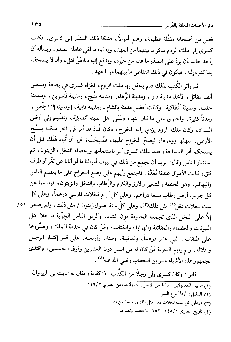 ثم واتر الكتب بذلك فلم يحفل بها ملك الروم، فغزاه كسرى فِي بضعة وتسعين ألف مُقَاتِل، فأخذ مدينة دارا، ومدينة الرهاء، ومدينة منبج، ومدينة قنسرين، ومدينة حلب، ومدينة أنطاكية- وكانت أفضل مدينة بالشام- ومدينة فامية، [ومدينة] [1] حمص، ومدنا كثيرة، واحتوى على ما كان منها، وسبى أهل مدينة أنطاكية، ونقلهم إِلَى أرض السواد، وكان ملك الروم يؤدي إِلَيْهِ الخراج، وكان قباذ قد أمر فِي آخر ملكه بمسح الأرض، سهلها ووعرها، ليصح الخراج عليها، فمسحت، غير أن قباذ هلك قبل أن يستحكم أمر المساحة، فلما ملك كسرى أمر باستتمامها وإحصاء النخل والزيتون، ثم استشار الناس وَقَالَ: نريد أن نجمع من ذلك فِي بيوت أموالنا ما لو أتانا عَنْ ثغر أو طرف فتق، كانت الأموال عندنا معدة. فاجتمع رأيهم عَلَى وضع الخراج عَلَى ما يعصم الناس والبهائم، وهو الحنطة والشعير والأرز والكرم والرّطاب والنخل والزيتون، فوضعوا عَنْ كل جريب أرض رطاب سبعة دراهم، وعلى كل أربع نخلات فارسي درهما، وعلى كل ست نخلات دقل [2] مثل ذلك [3] ، وعلى كل ستة أصول زيتون/ مثل ذلك، ولم يضعوا إلا عَلَى النخل الذي تجمعه الحديقة دون الشاذ، وألزموا الناس الجزية ما خلا أهل البيوتات والعظماء والمُقَاتِلة والهرابذة والكتاب، ومن كان فِي خدمة الملك، وصيروها عَلَى طبقات: اثني عشر درهما، وثمانية، وستة، وأربعة، عَلَى قدر إكثار الرجل وإقلاله، ولم يلزم الجزية من كان له من السن دون العشرين وفوق الخمسين، واقتدى بجمهور هَذِهِ الأشياء عمر بْن الخطاب رضي اللَّه عنه [4] .