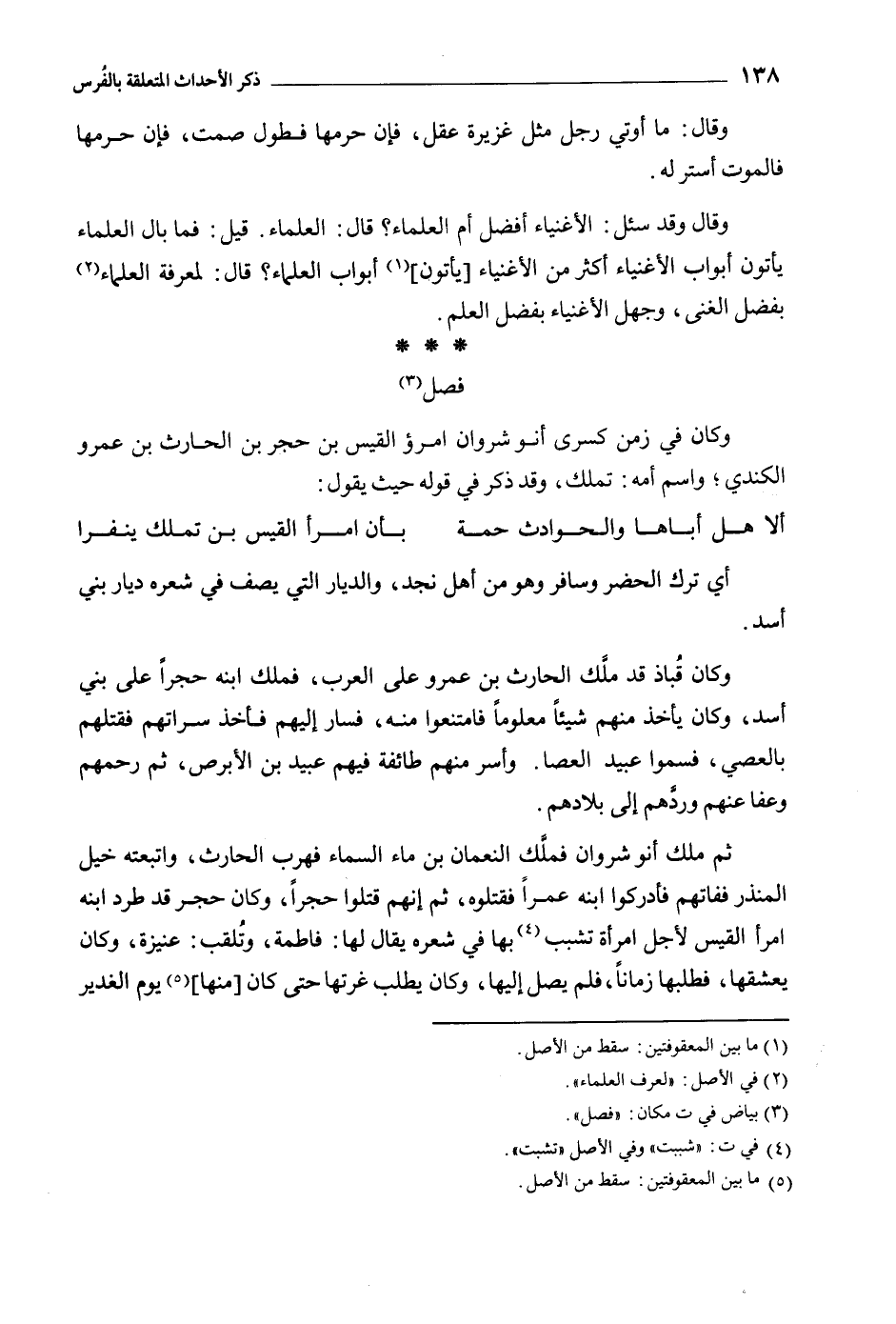 ثم ملك أنوشروان فملك النعمان بْن ماء السماء فهرب الحارث، واتبعته خيل المنذر ففاتهم فأدركوا ابنه عمرا فقتلوه، ثم إنهم قتلوا حجرا، وكان حجر قد طرد ابنه امرأ القيس لأجل امرأة تشبب [4] بها فِي شعره يقال لها: فاطمة، وتلقب: عنيزة، وكان يعشقها، فطلبها زمانا، فلم يصل إليها، وكان يطلب غرتها حَتَّى كان [منها] [5] يوم الغدير