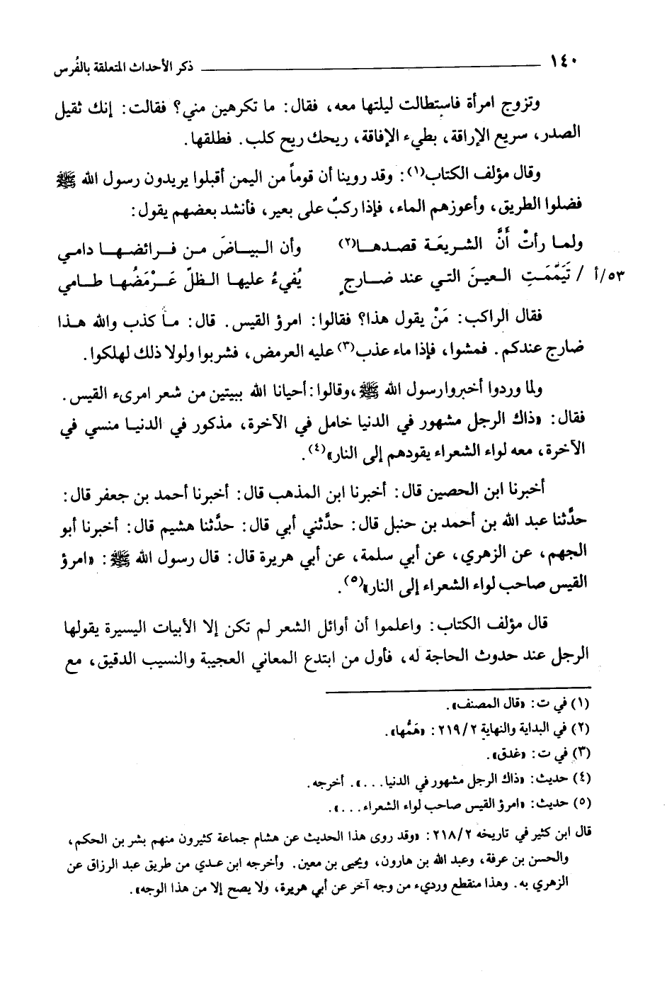حَدَّثَنَا عَبْدُ اللَّهِ بْن أَحْمَدَ بْنِ حَنْبَلٍ قال: حدثني أبي قَالَ: حَدَّثَنَا هُشَيْمٍ قَالَ: أَخْبَرَنَا أَبُو الْجَهْمِ، عَنِ الزُّهْرِيِّ، عَنْ أَبِي سَلَمَةَ، عَنْ أَبِي هُرَيْرَةَ قَالَ: قَالَ رَسُولُ اللَّهِ صلى الله عَلَيْهِ وَسَلَّمَ: «امْرُؤُ الْقَيْسِ صَاحِبُ لِوَاءِ الشُّعَرَاءِ إِلَى النَّارِ» [5] .