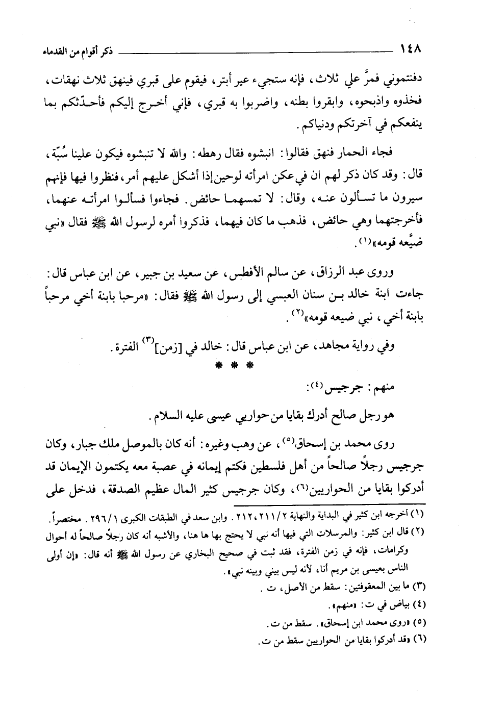 [2] قال ابن كثير: والمرسلات التي فيها أنه نبي لا يحتج بها هاهنا، والأشبه أنه كان رجلا صالحا له أحوال وكرامات، فإنه في زمن الفترة، فقد ثبت في صحيح البخاري عن رسول الله صلى الله عليه وسلم أنه قال: «إن أولى الناس بعيسى بن مريم أنا، لأنه ليس بيني وبينه نبي» .
