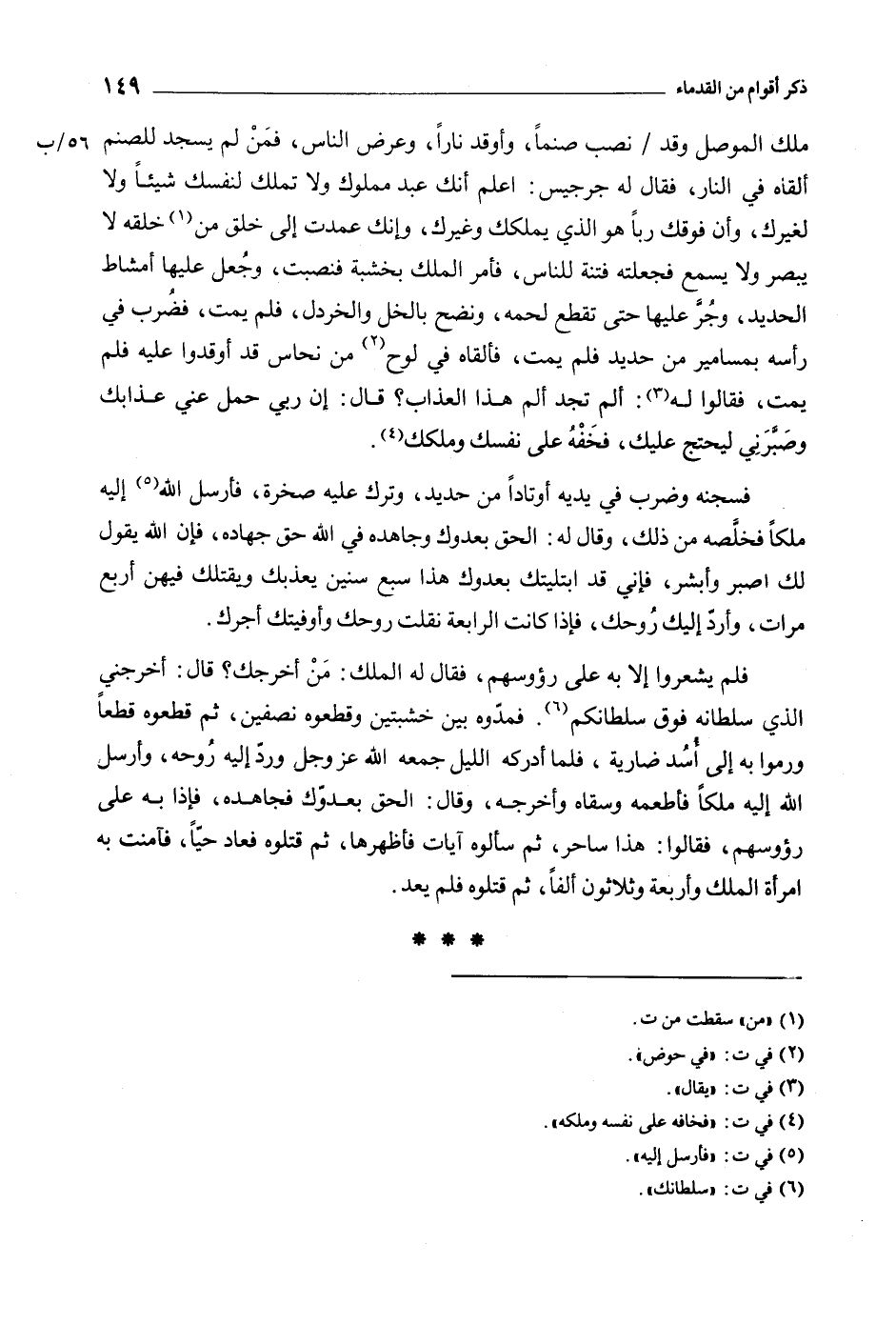 ملك الموصل وقد/ نصب صنما، وأوقد نارا، وعرض الناس، فمن لم يسجد للصنم ألقاه فِي النار، فَقَالَ له جرجيس: اعلم أنك عَبْد مملوك ولا تملك لنفسك شيئا ولا لغيرك، وأن فوقك ربا هو الّذي يملكك وغيرك، وإنك عمدت إِلَى خلق من [1] خلقه لا يبصر ولا يسمع فجعلته فتنة للناس، فأمر الملك بخشبة فنصبت، وجعل عليها أمشاط الحديد، وجر عليها حَتَّى تقطع لحمه، ونضح بالخل والخردل، فلم يمت، فضرب فِي رأسه بمسامير من حديد فلم يمت، فألقاه فِي لوح [2] من نحاس قد أوقدوا عَلَيْهِ فلم يمت، فقالوا له [3] : ألم تجد ألم هَذَا العذاب؟ قَالَ: إن ربي حمل عني عذابك وصبرني ليحتج عليك، فخفه عَلَى نفسك وملكك [4] .