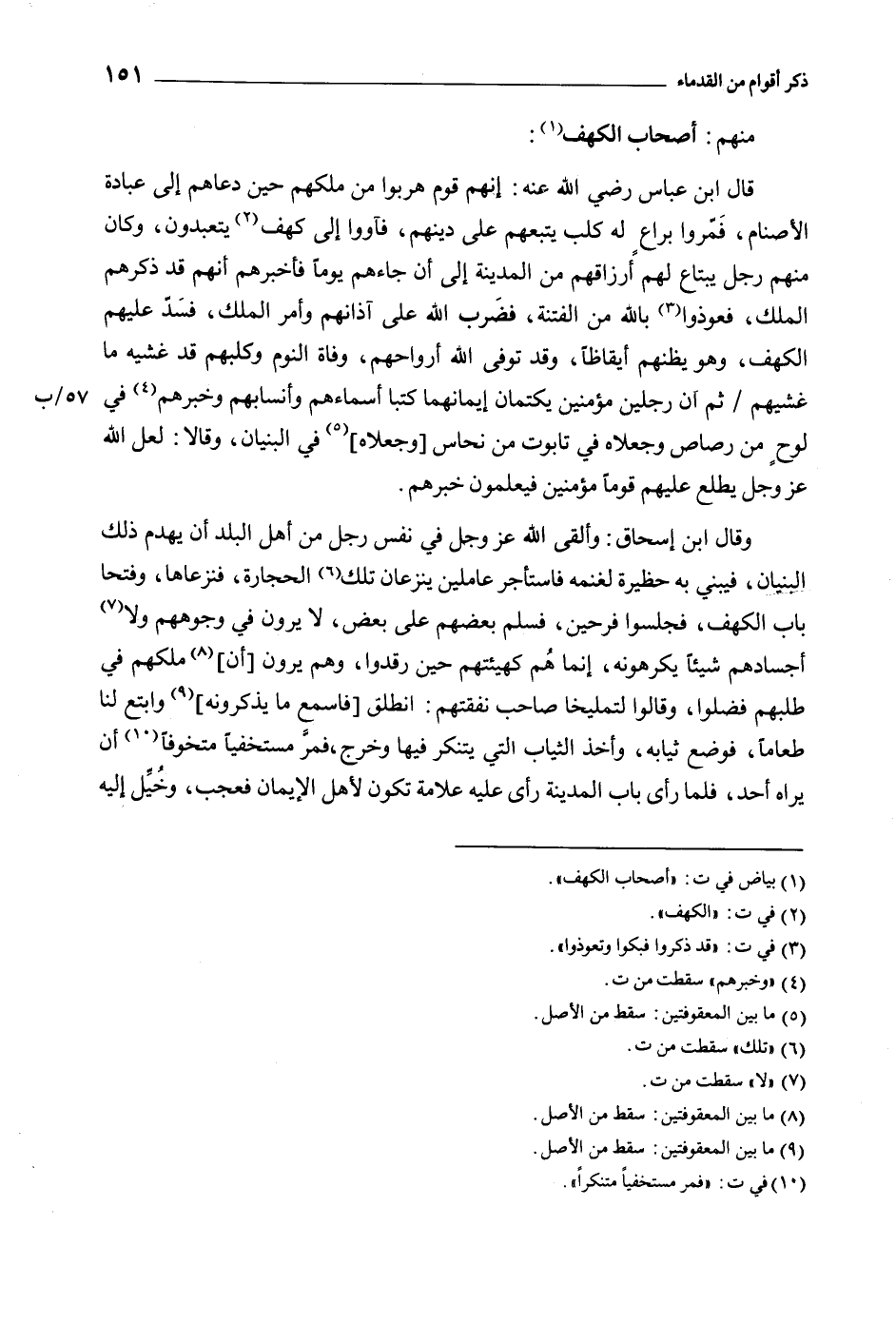 قَالَ ابن عباس رضي اللَّه عنه: إنهم قوم هربوا من ملكهم حين دعاهم إِلَى عبادة الأصنام، فمروا براع له كلب يتبعهم عَلَى دينهم، فآووا إِلَى كهف [2] يتعَبْدون، وكان منهم رجل يبتاع لهم أرزاقهم من المدينة إِلَى أن جاءهم يوما فأخبرهم أنهم قد ذكرهم الملك، فعوذوا [3] باللَّه من الفتنة، فضرب اللَّه عَلَى آذانهم وأمر الملك، فسد عليهم الكهف، وهو يظنهم أيقاظا، وقد توفى اللَّه أرواحهم، وفاة النوم وكلبهم قد غشيه ما غشيهم/ ثم إن رجلين مؤمنين يكتمان إيمانهما كتبا أسماءهم وأنسابهم وخبرهم [4] فِي لوح من رصاص وجعلاه فِي تابوت من نحاس [وجعلاه] [5] فِي البنيان، وَقَالَا: لعل اللَّه عز وجل يطلع عليهم قوما مؤمنين فيعلمون خبرهم.