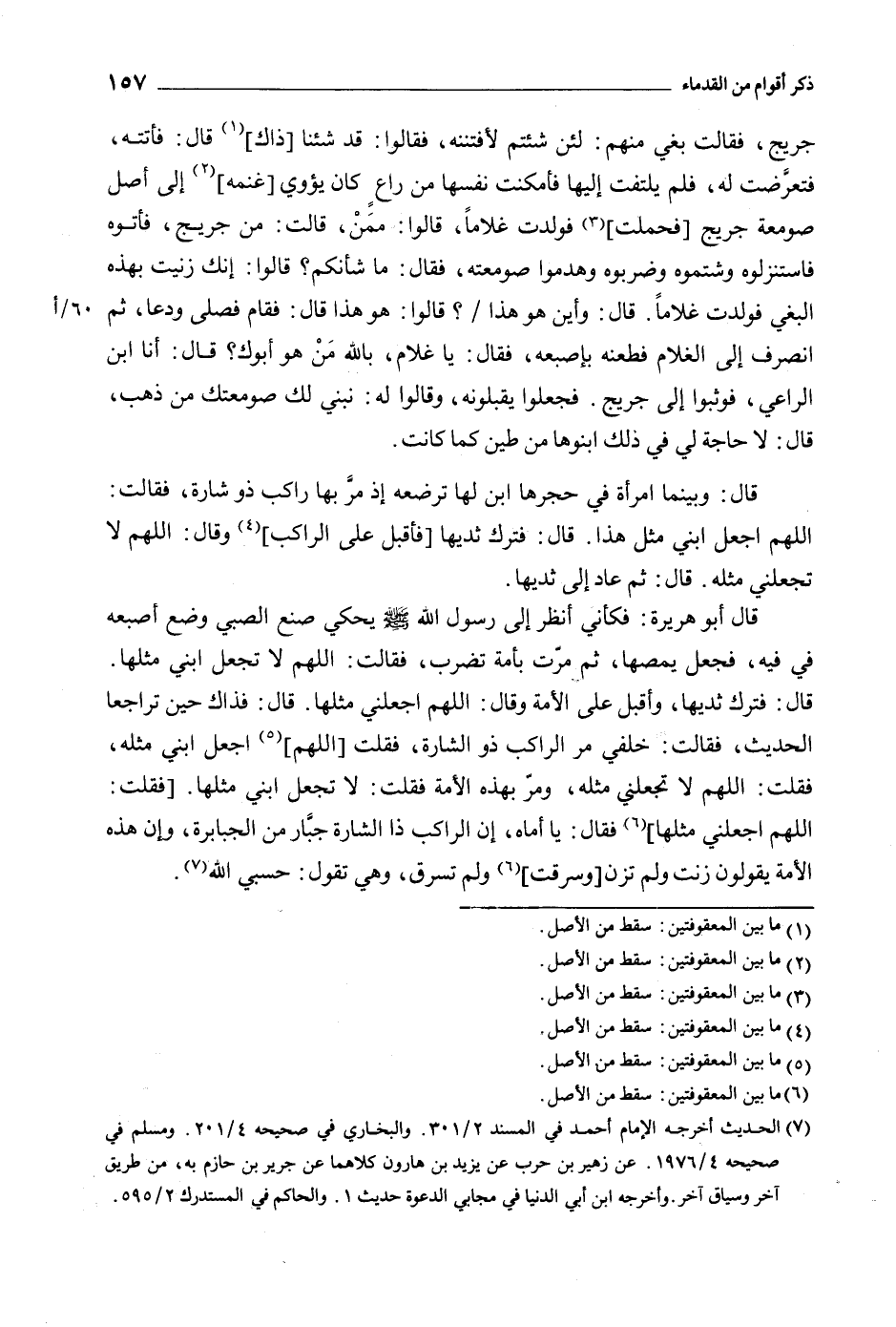 جُرَيجٍ، فَقَالَتْ بَغِيٌّ مِنْهُمْ: لَئِنْ شِئْتُمْ لأَفْتِنَنَّهُ، فَقَالُوا: قَدْ شِئْنَا [ذَاكَ] [1] قَالَ: فَأَتَتْهُ، فَتَعَرَّضَتْ لَهُ، فَلَمْ يَلْتَفِتْ إِلَيْهَا فَأَمْكَنَتْ نَفْسَهَا مِنْ راع كان يؤوي [غَنَمَهُ] [2] إِلَى أَصْلِ صَوْمَعَةِ جُرَيْجٍ [فَحَمَلَتْ] [3] فَوَلَدَتْ غُلامًا، قَالُوا: مِمَّنْ، قَالَتْ: مِنْ جُرَيْجٍ، فَأَتَوْهُ فَاسْتَنْزَلُوهُ وَشَتَمُوهُ وَضَرَبُوهُ وَهَدَمُوا صَوْمَعَتَهُ، فَقَالَ: مَا شَأْنُكُمْ؟ قَالُوا: إِنَّكَ زَنَيْتَ بِهَذِهِ الْبَغِيِّ فَوَلَدَتْ غُلامًا. قَالَ: وَأَيْنَ هُوَ هَذَا/؟ قَالُوا: هُوَ هذا قال: فقام فصلى وَدَعَا، ثُمَّ انْصَرَفَ إِلَى الْغُلامِ فَطَعَنَهُ بِأُصْبُعِهِ، فَقَالَ: يَا غُلامُ، باللَّه مَنْ هُوَ أَبُوكَ؟ قَالَ: أَنَا ابْنُ الرَّاعِي، فَوَثَبُوا إِلَى جُرَيْجٍ. فَجَعَلُوا يُقَبِّلُونَهُ، وَقَالُوا لَهُ: نَبْنِي لَكَ صَوْمَعَتَكَ مِنْ ذَهَبٍ، قَالَ: لا حَاجَةَ لِي فِي ذَلِكَ ابْنُوهَا مِنْ طِينٍ كَمَا كَانَتْ.