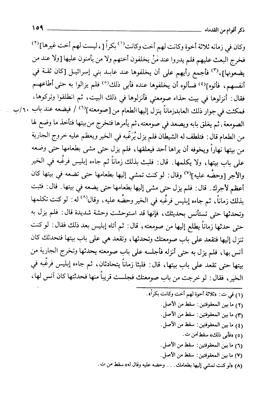 وَكَانَ فِي زَمَانِهِ ثَلاثَةُ إِخْوَةٌ وَكَانَتْ لَهُمْ أُخْتٌ وَكَانَتْ [1] بِكْرًا [، لَيْسَتْ لَهُمْ أُخْتٌ غَيْرُهَا] [2] فَخَرَجَ الْبَعْثُ عَلَيْهِمْ فَلَمْ يَدْرُوا عِنْدَ مَنْ يُخَلِّفُونَ أُخْتَهُمْ وَلا مَنْ يَأْمَنُونَ عَلَيْهَا [وَلا عِنْدَ مَنْ يَضَعُونَهَا] ، [3] فَأَجْمَعَ رَأْيُهُمْ عَلَى أَنْ يُخَلِّفُوهَا عِنْدَ عَابِدِ بَنِي إِسْرَائِيلَ [كَانَ ثِقَةً في أنفسهم، فأتوه] [4] فسألوه أن يُخَلِّفُوهَا عِنْدَهُ فَأَبَى ذَلِكَ [5] فَلَمْ يَزَالُوا بِهِ حَتَّى أَطَاعَهُمْ فَقَالَ: أَنْزِلُوهَا فِي بَيْتِ حِذَاءِ صَوْمَعَتِي فَأَنْزَلُوهَا فِي ذَلِكَ الْبَيْتِ، ثُمَّ انْطَلَقُوا وَتَرَكُوهَا، فَمَكَثَتْ فِي جِوَارِ ذَلِكَ الْعَابِدِ زَمَانًا يُنْزِلُ إِلَيْهَا الطَّعَامَ مِنْ [صَوْمَعَتِهِ] [6] فَيَضَعُهُ عِنْدَ بَابِ الصَّوْمَعَةِ، ثُمَّ يُغْلِقُ بَابَهُ وَيَصْعَدُ فِي صَوْمَعَتِهِ، ثُمَّ يَأْمُرُهَا فَتَخْرُجُ مِنْ بَيْتِهَا فَتَأْخُذُ مَا وُضِعَ لَهَا مِنَ الطَّعَامِ قَالَ: فَتَلَطَّفَ لَهُ الشَّيْطَانُ فَلَمْ يَزَلْ يُرَغِّبُهُ فِي الْخَيْرِ وَيُعَظِّمُ عَلَيْهِ خُرُوجَ الْجَارِيَةِ مِنْ بَيْتِهَا نَهَارًا وَيُخَوِّفُهُ أَنْ يَرَاهَا أَحَدٌ فَيُعَلَّقَهَا، فَلَمْ يَزَلْ حَتَّى مَشَى بِطَعَامِهَا حَتَّى وَضَعَهُ عَلَى بَابِ بَيْتِهَا، وَلا يُكَلِّمَهَا. قَالَ: فَلَبِثَ بِذَلِكَ زَمَانًا ثُمَّ جَاءَهُ إِبْلِيسُ فَرَغَّبَهُ فِي الْخَيْرِ وَالأَجْرِ [وَحَضَّهُ عَلَيْهِ] [7] وَقَالَ: لَوْ كُنْتَ تَمْشِي إِلَيْهَا بِطَعَامِهَا حَتَّى تَضَعَهُ فِي بَيْتِهَا كَانَ أَعْظَمَ لأَجْرِكَ. قَالَ: فَلَمْ يَزَلْ حَتَّى مَشَى إِلَيْهَا بِطَعَامِهَا حَتَّى يَضَعَهُ فِي بَيْتِهَا. قَالَ: فَثَبُتَ بِذَلِكَ زَمَانًا، ثُمَّ جَاءَهُ إِبْلِيسُ فَرَغَّبَهُ فِي الخير وحضّه عليه، وقال [8] له: لَوْ كُنْتَ تُكَلِّمُهَا وَتُحَدِّثُهَا حَتَّى تَسْتَأْنِسَ بِحَدِيثِكَ، فَإِنَّهَا قَدِ اسْتَوْحَشَتْ وَحْشَةً شَدِيدَةً قَالَ: فَلَمْ يَزَلْ بِهِ حَتَّى حَدَّثَهَا زَمَانًا يَطْلُعُ إِلَيْهَا مِنْ صَوْمَعَتِهِ، قَالَ: ثُمَّ أَتَاهُ إِبْلِيسُ بَعْدَ ذلك فقال: لو كنت تَنْزِلُ إِلَيْهَا فَتَقْعُدُ عَلَى بَابِ صَوْمَعَتِكَ وَتُحَدِّثُهَا، وَتَقْعُدُ هِيَ عَلَى بَابِ بَيْتِهَا فَتُحَدِّثُكَ كَانَ آنَسُ بِهَا، فَلَمْ يَزَلْ بِهِ حَتَّى أَنْزَلَهُ فَأَجْلَسَهُ عَلَى بَابِ صَوْمَعَتِهِ يُحَدِّثُهَا وَتَخْرُجُ الْجَارِيَةُ مِنْ بَيْتِهَا حَتَّى تَقْعُدَ عَلَى بَابِ بَيْتِهَا، قَالَ: فَلَبِثَا زَمَانًا يَتَحَادَثَانِ، ثُمَّ جَاءَهُ إِبْلِيسُ فَرَغَّبَهُ فِي الْخَيْرِ، فَقَالَ: لَوْ خَرَجْتَ مِنْ بَابِ صَوْمَعَتِكَ فَجَلَسْتَ قَرِيبًا مِنْهَا فَحَدَّثْتَهَا كَانَ آنس لها،