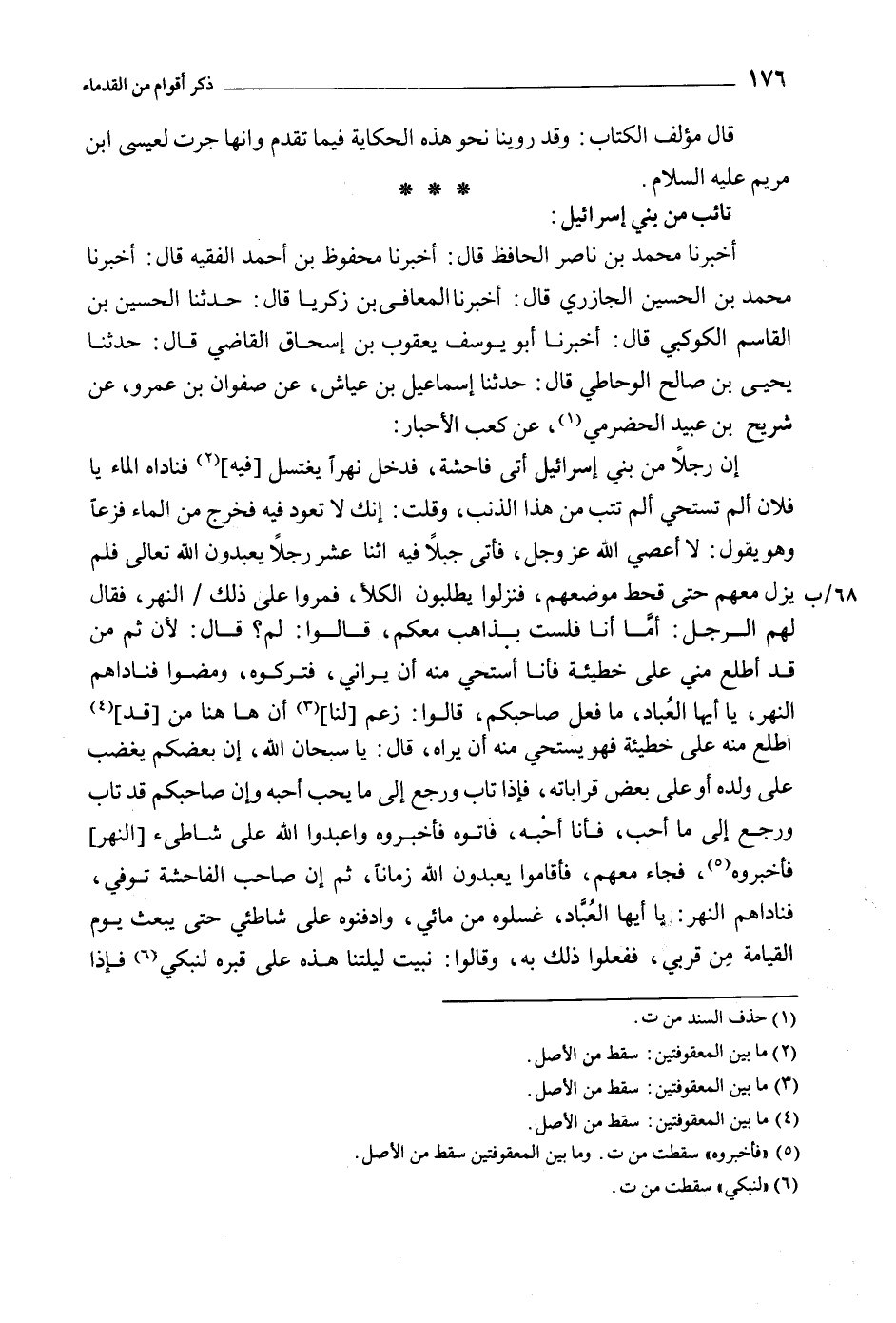 أن رجلا من بني إسرائيل أتى فاحشة، فدخل نهرا يغتسل [فيه] [2] فناداه الماء يا فلان ألم تستحي ألم تتب من هَذَا الذنب، وقلت: إنك لا تعود فيه فخرج من الماء فزعا وهو يقول: لا أعصي اللَّه عز وجل، فأتى جبلا فيه اثنا عشر رجلا يعَبْدون اللَّه تعالى فلم يزل معهم حَتَّى قحط موضعهم، فنزلوا يطلبون الكلأ، فمروا عَلَى ذلك/ النهر، فَقَالَ لهم الرجل: أما أنا فلست بذاهب معكم، قالوا: لم؟ قَالَ: لأن ثم من قد أطلع مني عَلَى خطيئة فأنا أستحي منه أن يراني، فتركوه، ومضوا فناداهم النهر، يا أيها العباد، ما فعل صاحبكم، قالوا: زعم [لنا] [3] أن هاهنا من [قد] [4] اطلع منه عَلَى خطيئة فهو يستحي منه أن يراه، قَالَ: يا سبحان الله، إن بعضكم يغضب على ولده أو عَلَى بعض قراباته، فإذا تاب ورجع إِلَى ما يحب أحبه وإن صاحبكم قد تاب ورجع إِلَى ما أحب، فأنا أحبه، فاتوه فأخبروه واعَبْدوا اللَّه عَلَى شاطئ [النهر] فأخبروه [5] ، فجاء معهم، فأقاموا يعَبْدون اللَّه زمانا، ثم إن صاحب الفاحشة توفي، فناداهم النهر: يا أيُّها العباد، غسلوه من مائي، وادفنوه على شاطئي حَتَّى يبعث يوم القيامة من قربي، ففعلوا ذَلِكَ به، وَقَالُوا: نبيت ليلتنا هَذِهِ عَلَى قبره لنبكي [6] فإذا