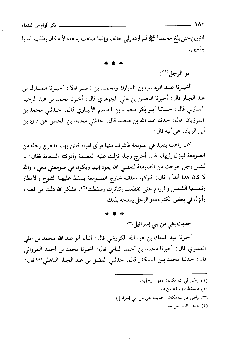 كان راهب يتعَبْد فِي صومعة فأشرف منها فرأى امرأة ففتن بها، فأخرج رجله من الصومعة لينزل إليها، فلما أخرج رجله نزلت عَلَيْهِ العصمة وأدركته السعادة فقال: يا لنفس رجل خرجت من الصومعة لتعصي اللَّه يعود إليها ويكون فِي صومعتي معي، والله لا كان هَذَا أبدا، قال: فتركها معلقة خارج الصومعة يسقط عليها الثلوج والأمطار وتصيبها الشمس والرياح حتى تقطعت وتناثرت وسقطت [2] ، فشكر اللَّه ذلك من فعله، وأنزل فِي بعض الكتب وذو الرجل يمدحه بذلك