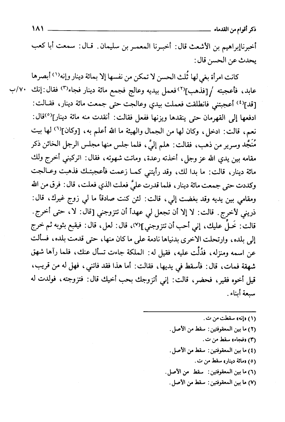 كانت امرأة بغي لها ثلث الحسن لا تمكن من نفسها إلا بمائة دينار وإنه [1] أبصرها عابد، فأعجبته/ [فذهب] [2] فعمل بيديه وعالج فجمع مائة دينار فجاء [3] فَقَالَ: إنك [قد] [4] أعجبتني فانطلقت فعملت بيدي وعالجت حَتَّى جمعت مائة دينار، فقالت: