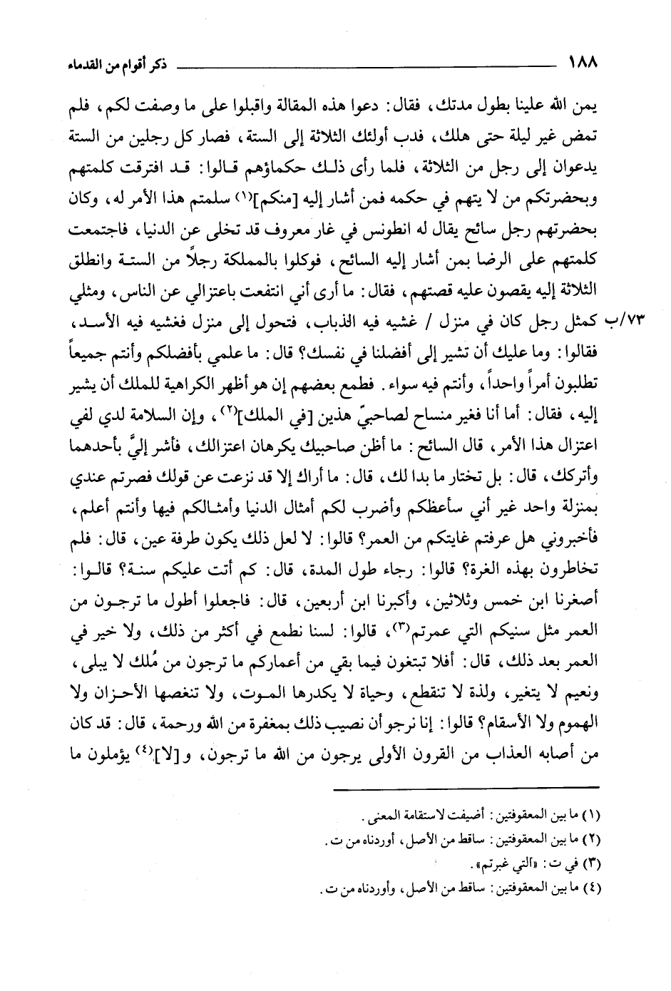 يمن اللَّه علينا بطول مدتك، فَقَالَ: دعوا هَذِهِ المقالة واقبلوا عَلَى ما وصفت لكم، فلم تمض غير ليلة حَتَّى هلك، فدب أولئك الثلاثة إِلَى الستة، فصار كل رجلين من الستة يدعوان إِلَى رَجُل من الثلاثة، فلما رأى ذلك حكماؤهم قالوا: قد افترقت كلمتهم وبحضرتكم من لا يتهم فِي حكمه فمن أشار إليه [منكم] [1] سلمتم هَذَا الأمر له، وكان بحضرتهم رجل سائح يقال له أنطونس فِي غار معروف قد تخلى عَنِ الدنيا، فاجتمعت كلمتهم عَلَى الرضا بمن أشار إليه السائح، فوكلوا بالمملكة رجلا من الستة وانطلق الثلاثة إليه يقصون عليه قصتهم، فقال: ما أرى أني انتفعت باعتزالي عَنِ الناس، ومثلي كمثل رجل كان فِي منزل/ غشيه فيه الذباب، فتحول إِلَى منزل فغشيه فيه الأسد، فقالوا: وما عليك أن تشير إِلَى أفضلنا فِي نفسك؟ قَالَ: ما علمي بأفضلكم وأنتم جميعا تطلبون أمرا واحدا، وأنتم فيه سواء. فطمع بعضهم إن هو أظهر الكراهية للملك أن يشير إليه، فَقَالَ: أما أنا فغير منساح لصاحبي هذين [فِي الملك] [2] ، وإن السلامة لدي لفي اعتزال هَذَا الأمر، قَالَ السائح: ما أظن صاحبيك يكرهان اعتزالك، فأشر إلي بأحدهما وأتركك، قَالَ: بل تختار ما بدا لك، قَالَ: ما أراك إلا قد نزعت عَنْ قولك فصرتم عندي بمنزلة واحد غير أني سأعظكم وأضرب لكم أمثال الدنيا وأمثالكم فيها وأنتم أعلم، فأخبروني هل عرفتم غايتكم من العمر؟ قالوا: لا لعل ذلك يكون طرفة عين، قَالَ: فلم تخاطرون بهذه الغرة؟ قالوا: رجاء طول المدة، قَالَ: كم أتت عليكم سنة؟ قالوا:
