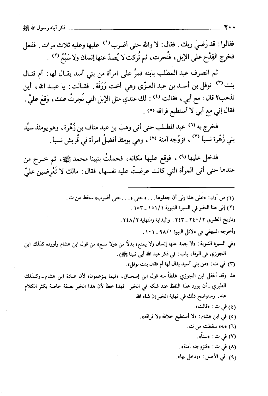 وفي السيرة النبويّة: «لا يصد عنها إنسان ولا يمنع» بدلا من «ولا سبع» من قول ابن هشام وأورده كذلك ابن الجوزي في ألوفا، باب: في ذكر عبد الله أبي نبينا صلى الله عليه وسلم) .