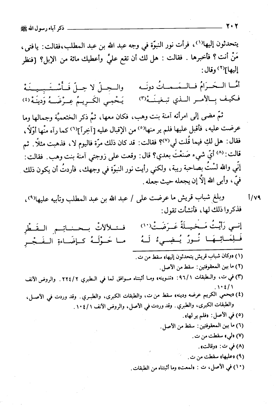 [4] «يحمي الكريم عرضه ودينه» سقط من ت، والطبقات الكبرى، والطبري. وقد وردت في الأصل، والطبقات الكبرى، والطبري. وقد وردت في الأصل، والروض الأنف 1/ 104.