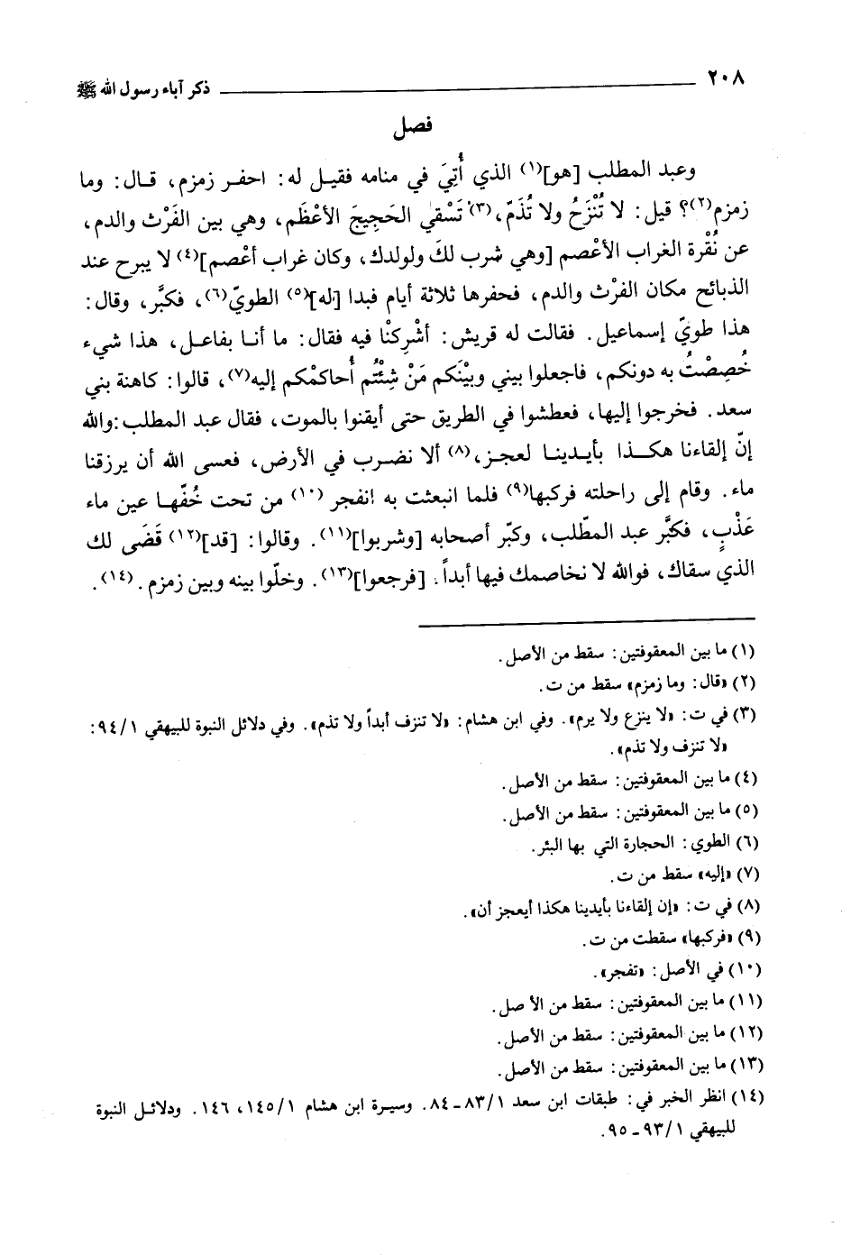 هَذَا طوي إسماعيل. فقالت له قريش: أشركنا فيه فَقَالَ: ما أنا بفاعل، هَذَا شَيْء خصصت به دونكم، فاجعلوا بيني وبينكم من شئتم أحاكمكم إليه [7] ، قالوا: كاهنة بني سعد. فخرجوا إليها، فعطشوا فِي الطريق حتى أيقنوا بالموت، فقال عبد المطلب: والله إن إلقاءنا هكذا بأيدينا لعجز، [8] ألا نضرب فِي الأرض، فعسى اللَّه أن يرزقنا ماء. وقام إِلَى راحلته فركبها [9] فلما انبعثت به انفجر [10] من تحت خفها عين ماء عذب، فكبّر عبد المطّلب، وكبر أصحابه [وشربوا] [11] . وَقَالُوا: [قد] [12] قضى لك الّذي سقاك، فو الله لا نخاصمك فيها أبدا. [فرجعوا] [13] . وخلوا بينه وبين زمزم. [14] .