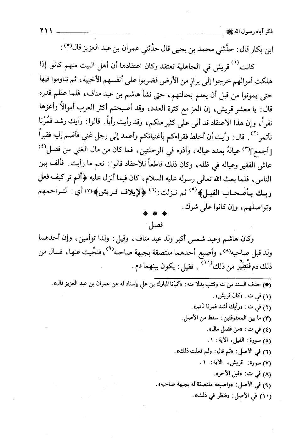كانت [2] قريش فِي الجاهلية تعتقد وكان اعتقادها أن أهل البيت منهم كانوا إذا هلكت أموالهم خرجوا إِلَى براز من الأرض فضربوا عَلَى أنفسهم الأخبية، ثم تناوموا فيها حَتَّى يموتوا من قبل أن يعلم بحالتهم، حَتَّى نشأ هاشم بْن عَبْد مناف، فلما عظم قدره قال: يا معشر قريش، إن العز مع كثرة العدد، وقد أصبحتم أكثر العرب أموالا وأعزها نفرا، وإن هَذَا الاعتقاد قد أتى عَلَى كثير منكم، وقد رأيت رأيا. قالوا: رأيك رشد فمرنا نأتمر [3] . قال: رأيت أن أخلط فقراءكم بأغنيائكم وأعمد إِلَى رجل غني فأضم إليه فقيرا [أجمع] [4] عياله بعدد عياله، وأذره فِي الرحلتين، فما كان من مال الغني من فضل [5] عاش الفقير وعياله فِي ظله، وكان ذلك قاطعا للأحقاد قالوا: نعم ما رأيت. فألف بين الناس، فلما بعث اللَّه تعالى رسوله عَلَيْهِ السلام، كان فيما أنزل عَلَيْهِ أَلَمْ تَرَ كَيْفَ فَعَلَ رَبُّكَ بِأَصْحابِ الْفِيلِ 105: 1 [6] ثم نزلت: [7] لِإِيلافِ قُرَيْشٍ 106: 1 [8] أي: لتراحمهم وتواصلهم، وإن كانوا عَلَى شرك