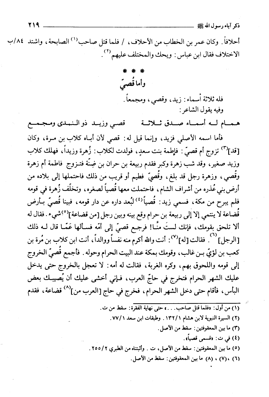 فأما اسمه الأصلي فزيد، وإنما قيل له: قصي لأن أباه كلاب بْن مرة، وكان [قد] [3] تزوج أم قصي: فاطمة بنت سعد، فولدت لكلاب: زهرة وزيدا، فهلك كلاب وزيد صغير، وقد شب زهرة وكبر فقدم ربيعة بْن حران بْن ضنة فتزوج فاطمة أم زهرة وقصي، وزهرة رجل قد بلغ، وقصيّ فطيم أو قريب من ذلك فاحتملها إِلَى بلاده من أرض بني عذره من أشراف الشام، فاحتملت معها قصيا لصغره، وتخلف زهرة فِي قومه فلم يبرح من مكة، فسمي زيد: قصيا [4] لبعد داره عَنْ دار قومه، فبينا قصي بأرض قضاعة لا ينتمي إلا إِلَى ربيعة بْن حرام وقع بينه وبين رجل [من قضاعة] [5] شَيْء. فَقَالَ له ألا تلحق بقومك، فإنك لست منا! فرجع قصي إِلَى أمه فسألها عمّا قال له ذلك [الرجل] [6] . فقالت [له] [7] : أنت والله أكرم منه نفسا ووالدا، أنت ابن كلاب بْن مرة بْن كعب بْن لؤي بْن غالب، وقومك بمكة عند البيت الحرام وحوله. فأجمع قصي الخروج إِلَى قومه واللحوق بهم، وكره الغربة، فقالت له أمه: لا تعجل بالخروج حتى يدخل عليك الشهر الحرام فتخرج فِي حاج العرب، فإني أخشى عليك أن يصيبك بعض البأس، فأقام حَتَّى دخل الشهر الحرام، فخرج في حاج [العرب من] [8] قضاعة، فقدم