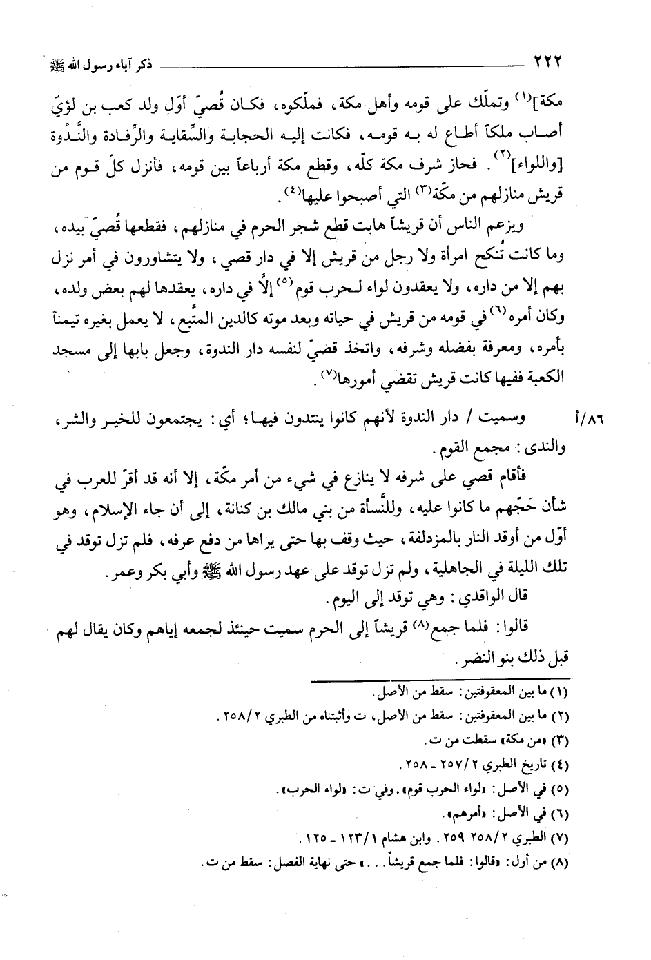 فأقام قصي عَلَى شرفه لا ينازع فِي شَيْء من أمر مكة، إلا أنه قد أقر للعرب فِي شأن حجهم ما كانوا عَلَيْهِ، وللنسأة من بني مالك بْن كنانة، إِلَى أن جاء الإسلام، وهو أول من أوقد النار بالمزدلفة، حيث وقف بها حَتَّى يراها من دفع عرفه، فلم تزل توقد فِي تلك الليلة فِي الجاهلية، ولم تزل توقد عَلَى عهد رسول الله صلَّى اللَّه عَلَيْهِ وسلم وأبي بكر وعمر.