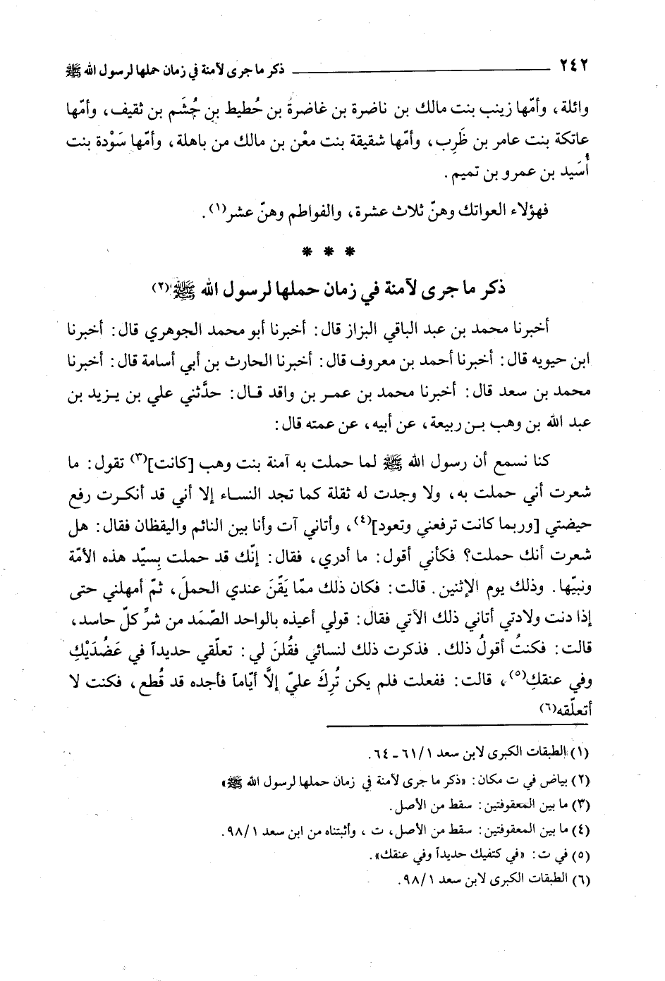 [2] بياض في ت مكان: «ذكر ما جرى لآمنة فِي زمان حملها لرسول الله صَلَّى اللَّهُ عَلَيْهِ وَسَلَّمَ» .