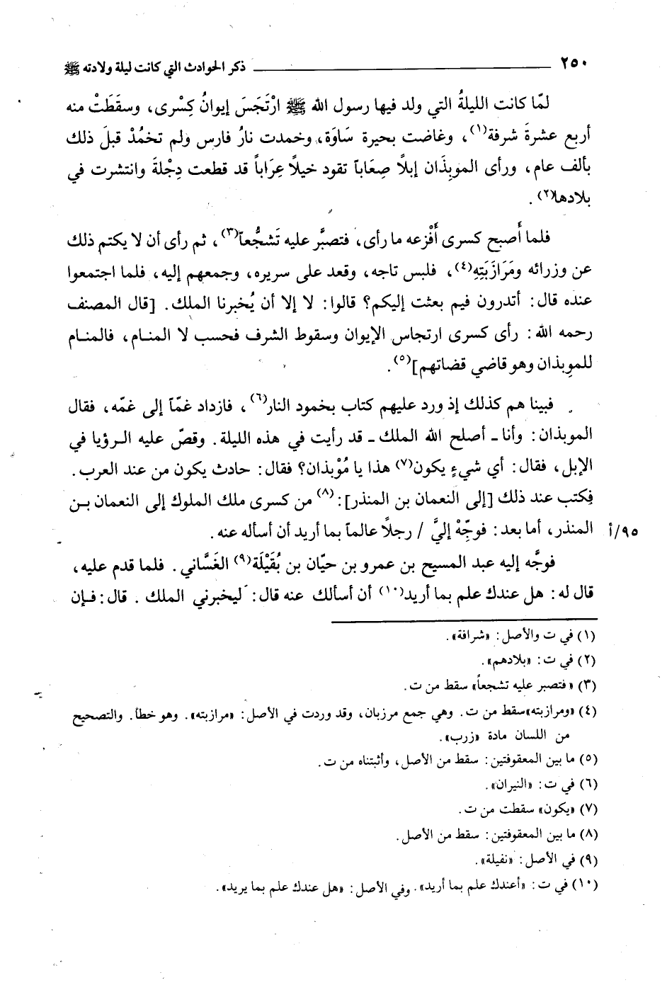 فلما أصبح كسرى أفزعه ما رأى، فتصبر عَلَيْهِ تشجعا [3] ، ثم رأى أن لا يكتم ذلك عَنْ وزرائه ومرازبته [4] ، فلبس تاجه، وقعد عَلَى سريره، وجمعهم إليه، فلما اجتمعوا عنده قَالَ: أتدرون فيم بعثت إليكم؟ قالوا: لا إلا أن يخبرنا الملك. [قَالَ المصنف رحمه اللَّه: رأى كسرى ارتجاس الإيوان وسقوط الشرف فحسب لا المنام، فالمنام للموبذان وهو قاضي قضاتهم] [5] .