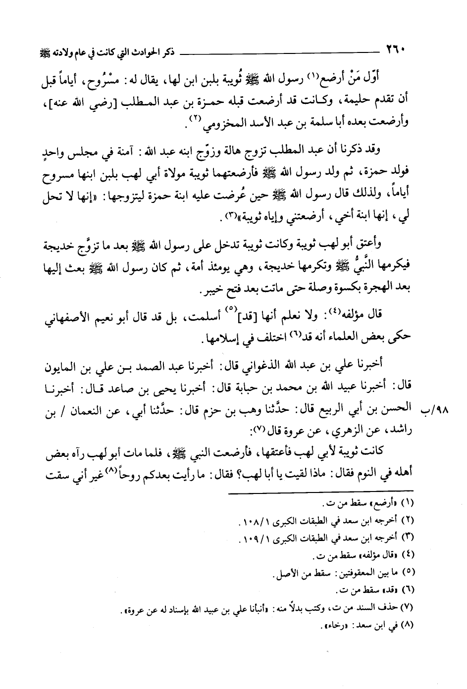 وقد ذكرنا أن عَبْد المطلب تزوج هالة وزوّج ابن عَبْد اللَّه: آمنة فِي مجلس واحد فولد حمزة، ثُمَّ ولد رَسُول اللَّه صَلَّى اللَّه عَلَيْهِ وَسَلَّمَ فأرضعتهما ثويبة مولاة أبي لهب بلبن ابنها مسروح أياما، ولذلك قَالَ رَسُولُ اللَّهِ صَلَّى اللَّهُ عَلَيْهِ وَسَلَّمَ حين فرضت عَلَيْهِ ابنة حمزة ليتزوجها: «إنها لا تحل لي، إنها ابنة أخي، أرضعتني وإياه ثويبة» [3] . وأعتق أَبُو لهب ثويبة وكانت ثويبة تدخل على رسول الله صلى الله عليه وسلم بعد ما تزوّج خديجة فيكرمها النّبيّ صلى الله عليه وسلم وتكرمها خديجة، وهي يومئذ أمة، ثم كَانَ رَسُول اللَّهِ صَلَّى اللَّهُ عَلَيْهِ وَسَلَّمَ بعث إليها بعد الهجرة بكسوة وصلة حَتَّى ماتت بعد فتح خيبر.