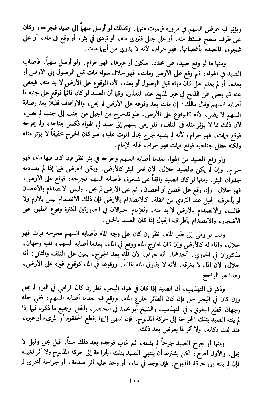ومنها لو رمى إلى طير الماء، نظر إن كان على وجه الماء فأصابه السهم فجرحه فمات فهو حلال، والماء له كالأرض وإن كان خارج الماء ووقع في الماء، بعدما أصابه السهم، ففيه وجهان، مذكوران في الحاوي، أحدهما: أنه حرام، لأن الماء بعد الجرح، يعين على التلف والثاني: أنه حلال، لأن الماء لا يغرقه، لأنه لا يفارق الماء غالبا. ووقوعه في الماء كوقوع غيره على الأرض، وهذا هو الراجح.