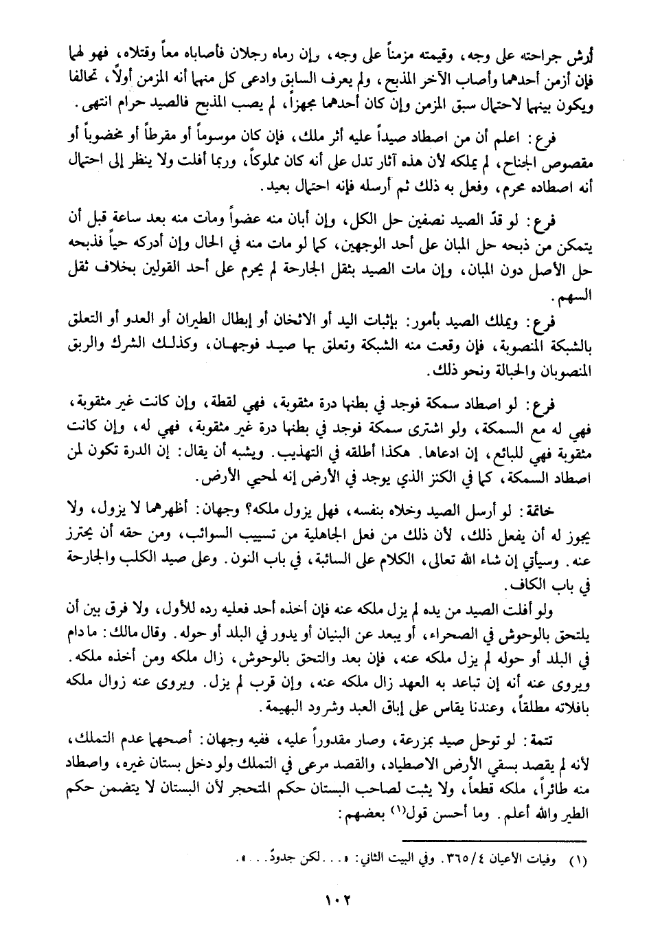 : ويملك الصيد بأمور: بإثبات اليد أو الاثخان أو إبطال الطيران أو العدو أو التعلق بالشبكة المنصوبة، فإن وقعت منه الشبكة وتعلق بها صيد فوجهان، وكذلك الشرك والربق المنصوبان والحبالة ونحو ذلك.