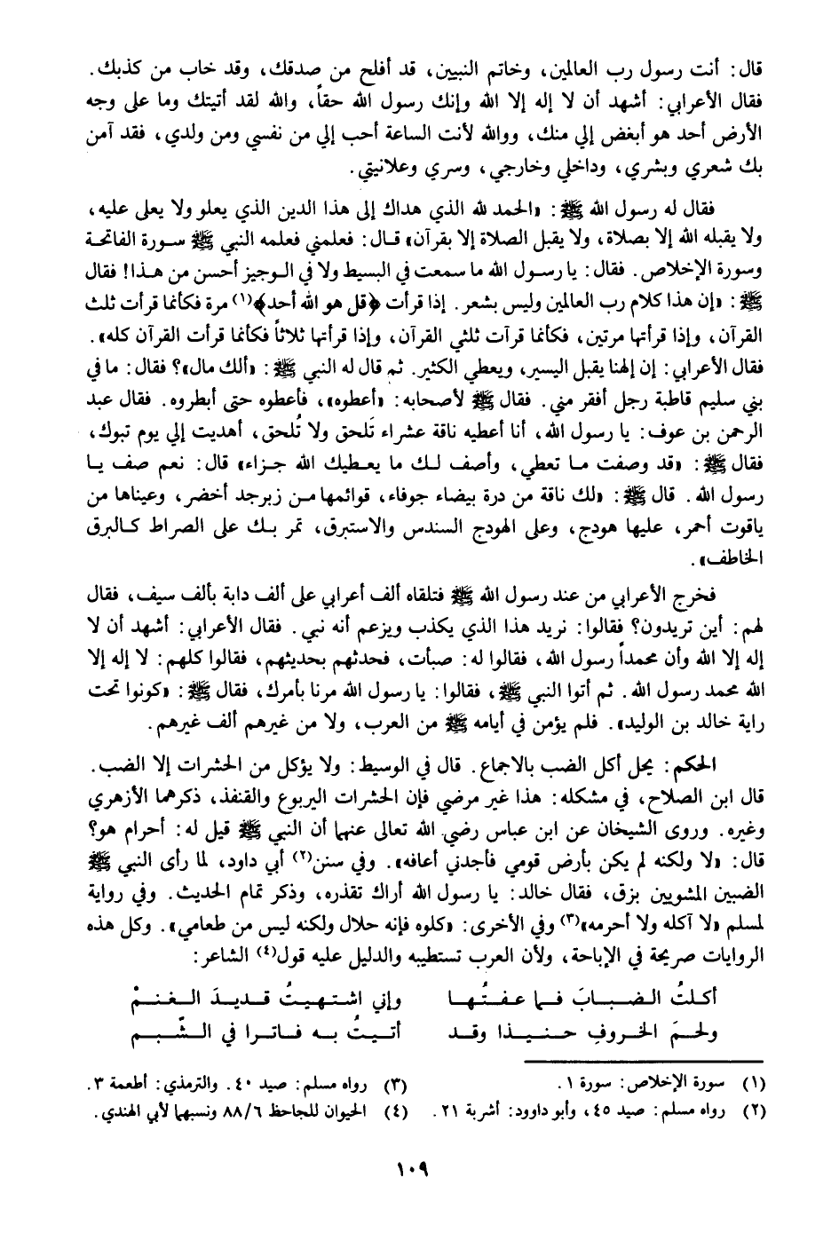 فقال له رسول الله صلى الله عليه وسلم: «الحمد لله الذي هداك إلى هذا الدين الذي يعلو ولا يعلى عليه، ولا يقبله الله إلا بصلاة، ولا يقبل الصلاة إلا بقرآن» قال: فعلمني فعلمه النبي صلى الله عليه وسلم سورة الفاتحة وسورة الإخلاص. فقال: يا رسول الله ما سمعت في البسيط ولا في الوجيز أحسن من هذا! فقال صلى الله عليه وسلم: «إن هذا كلام رب العالمين وليس بشعر. إذا قرأت قُلْ هُوَ اللَّهُ أَحَدٌ