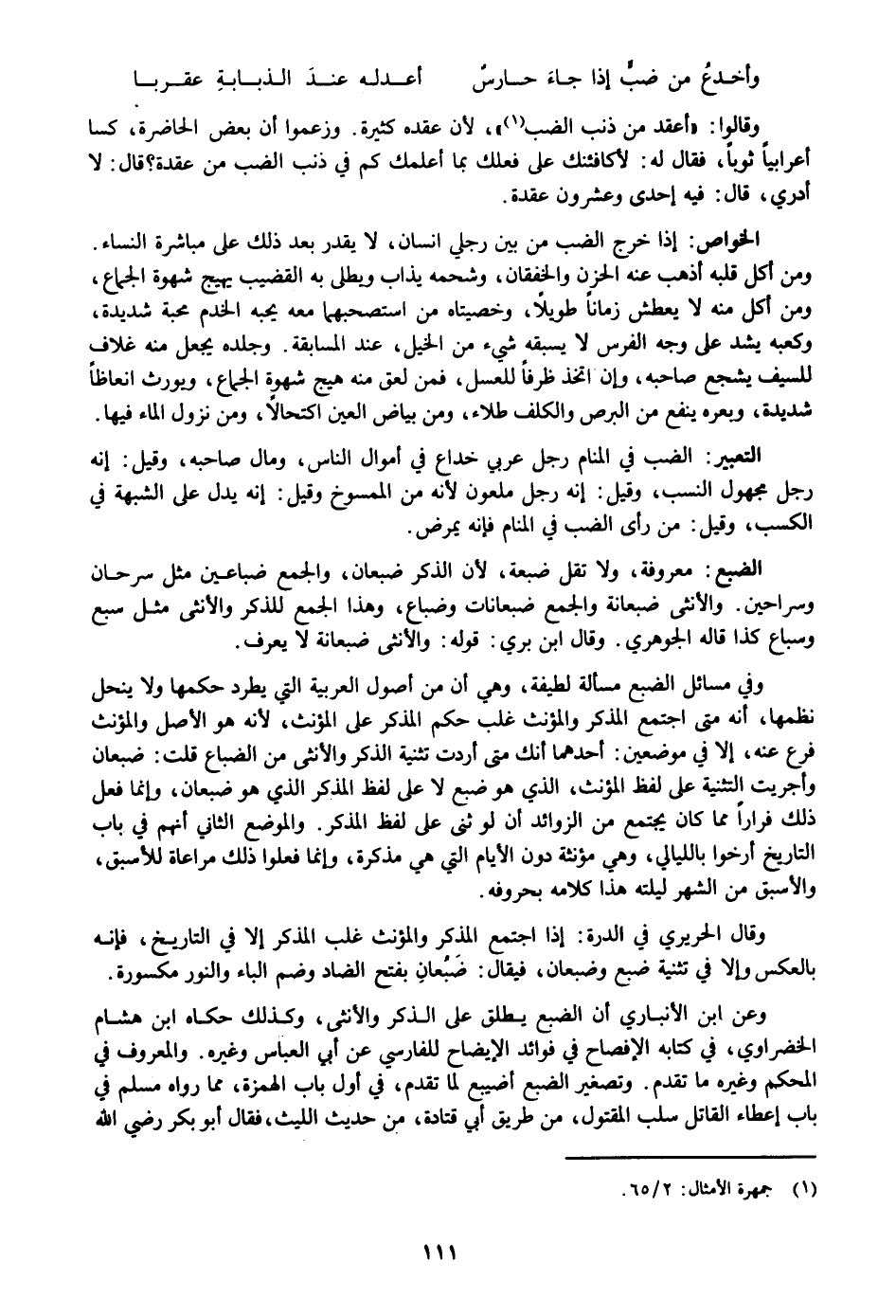 » ، لأن عقده كثيرة. وزعموا أن بعض الحاضرة، كسا أعرابيا ثوبا، فقال له: لأكافئنك على فعلك بما أعلمك كم في ذنب الضب من عقدة؟ قال: لا أدري، قال: فيه إحدى وعشرون عقدة.
