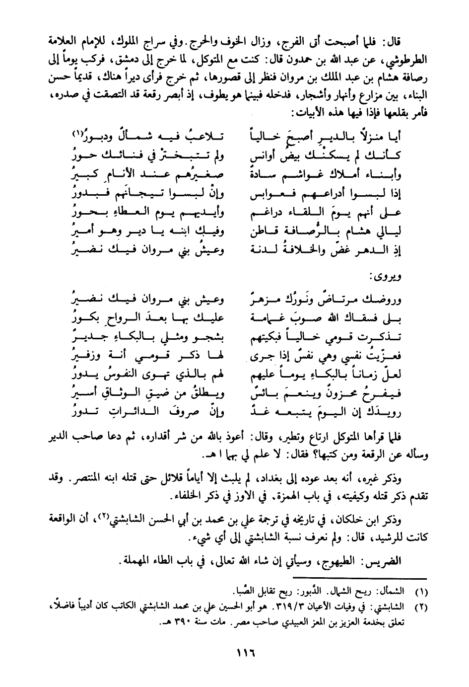 قال: فلما أصبحت أتى الفرج، وزال الخوف والحرج. وفي سراج الملوك، للإمام العلامة الطرطوشي، عن عبد الله بن حمدون قال: كنت مع المتوكل، لما خرج إلى دمشق، فركب يوما إلى رصافة هشام بن عبد الملك بن مروان فنظر إلى قصورها، ثم خرج فرأى ديرا هناك، قديما حسن البناء، بين مزارع وأنهار وأشجار، فدخله فبينما هو يطوف، إذ أبصر رقعة قد التصقت في صدره، فأمر بقلعها فإذا فيها هذه الأبيات:
