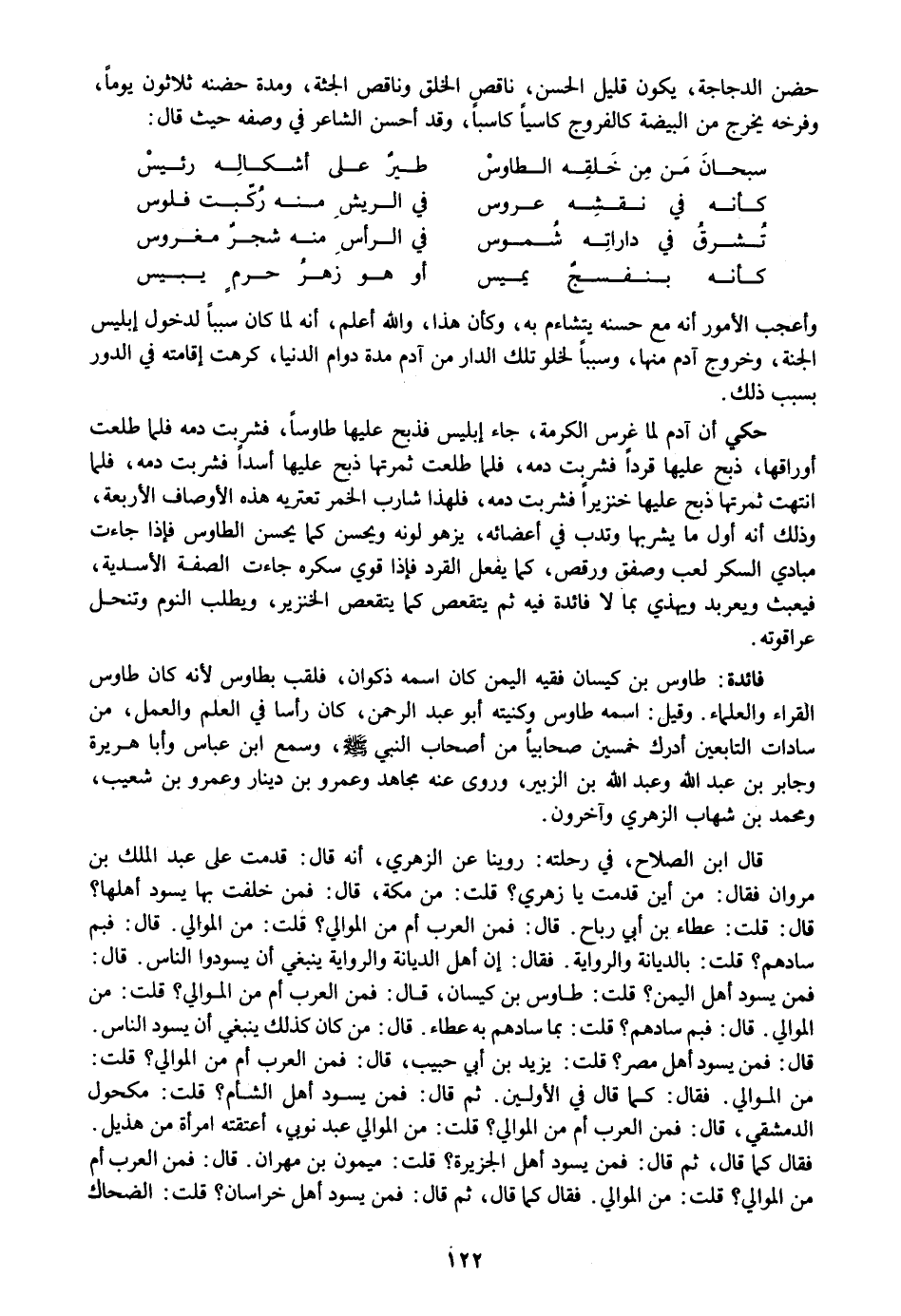 فمن يسود أهل اليمن؟ قلت: طاوس بن كيسان، قال: فمن العرب أم من الموالي؟ قلت: من الموالي. قال: فبم سادهم؟ قلت: بما سادهم به عطاء. قال: من كان كذلك ينبغي أن يسود الناس.