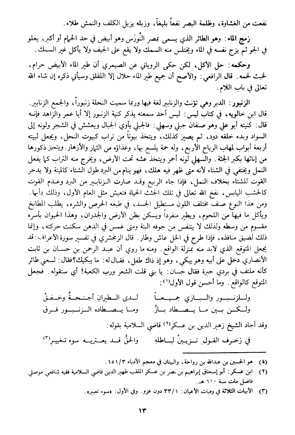 ومن هذا النوع صنف مختلف اللون مستطيل الجسد، في طبعه الحرص والشره، يطلب المطابخ ويأكل ما فيها من اللحوم، ويطير منفردا ويسكن بطن الأرض والجدران، وهذا الحيوان بأسره مقسوم من وسطه ولذلك لا يتنفس من جوفه البتة ومتى غمس في الدهن سكنت حركته، وإنما ذلك لضيق منافذه، فإذا طرح في الخل عاش وطار. قال الزمخشري في تفسير سورة الأعراف: قد يجعل المتوقع الذي لا بد منه بمنزلة الواقع. ومنه ما روي أن عبد الرحمن بن حسان بن ثابت الأنصاري دخل على أبيه وهو يبكي، وهو إذ ذاك طفل، فقال له: ما يبكيك؟ فقال: لسعني طائر كأنه ملتف في بردي حبرة فقال حسان: يا بني قلت الشعر ورب الكعبة! أي ستقوله. فجعل المتوقع كالواقع. وما أحسن قول الأول «1» :