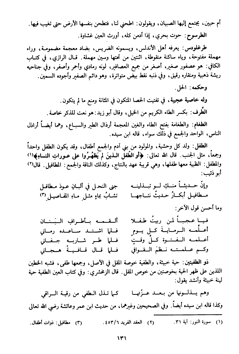 ولد كل وحشية، والمولود من بني آدم والجمع أطفال، وقد يكون الطفل واحدا وجمعا، مثل الجنب. قال الله تعالى: أَوِ الطِّفْلِ الَّذِينَ لَمْ يَظْهَرُوا عَلى عَوْراتِ النِّساءِ