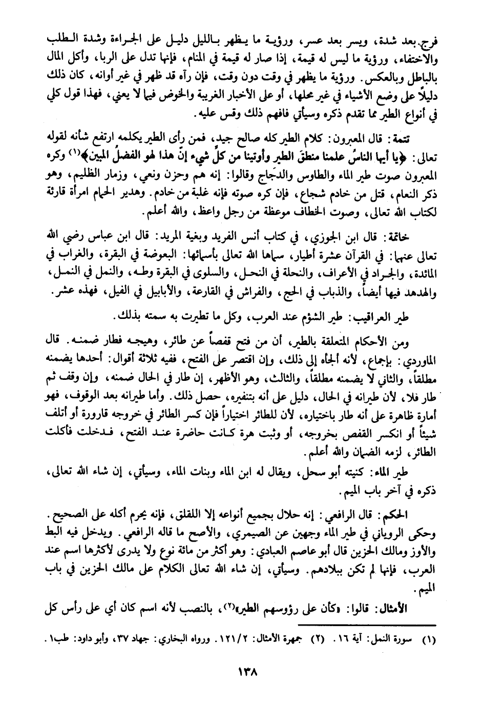 فرج بعد شدة، ويسر بعد عسر، ورؤية ما يظهر بالليل دليل على الجراءة وشدة الطلب والاختفاء، ورؤية ما ليس له قيمة، إذا صار له قيمة في المنام، فإنها تدل على الربا، وأكل المال بالباطل وبالعكس. ورؤية ما يظهر في وقت دون وقت، فإن رآه قد ظهر في غير أوانه، كان ذلك دليلا على وضع الأشياء في غير محلها، أو على الأخبار الغريبة والخوض فيما لا يعني، فهذا قول كلي في أنواع الطير مما تقدم ذكره وسيأتي فافهم ذلك وقس عليه.