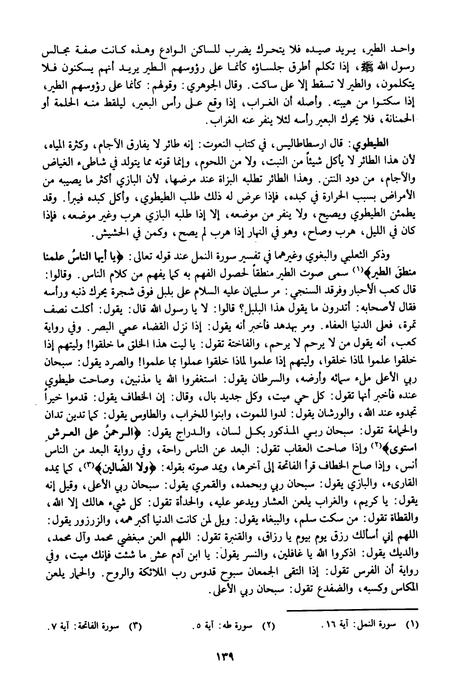 وذكر الثعلبي والبغوي وغيرهما في تفسير سورة النمل عند قوله تعالى: يا أَيُّهَا النَّاسُ عُلِّمْنا مَنْطِقَ الطَّيْرِ