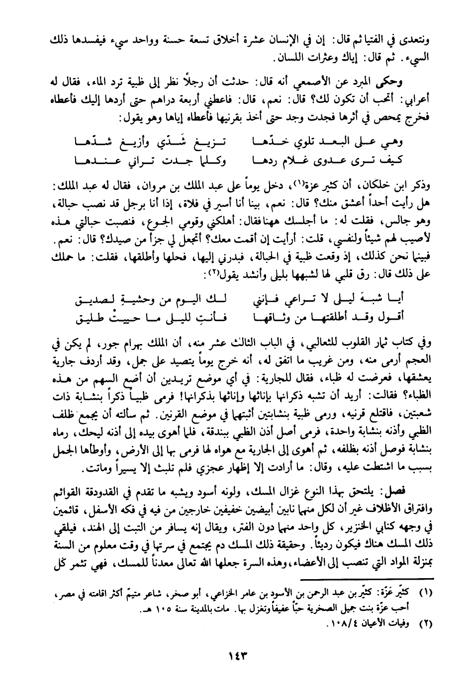 فبينما نحن كذلك، إذ وقعت ظبية في الحبالة، فبدرني إليها، فحلها وأطلقها، فقلت: ما حملك على ذلك قال: رق قلبي لها لشبهها بليلى وأنشد يقول «2» :