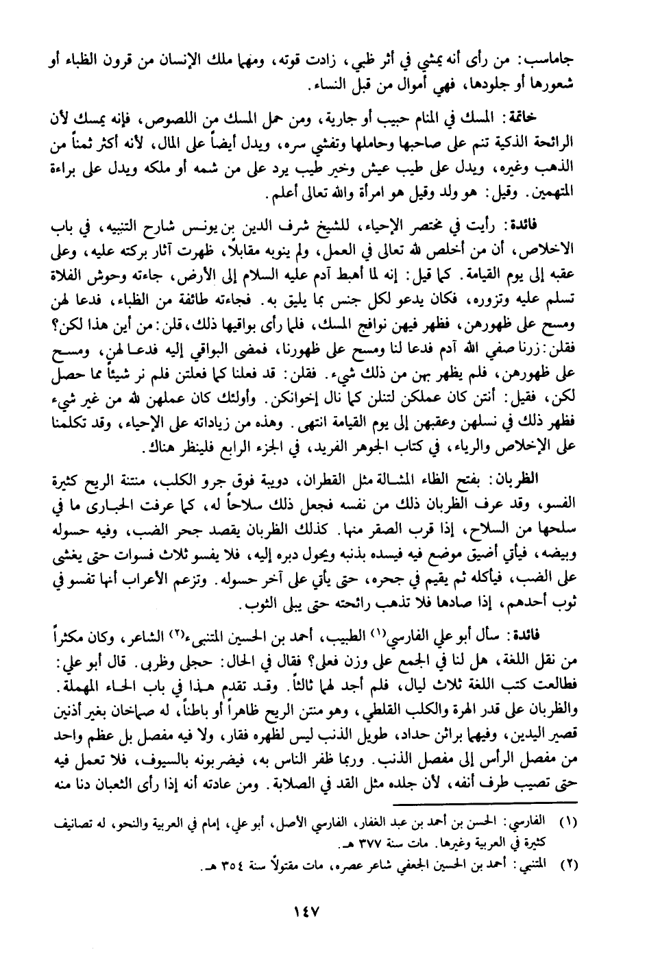 : رأيت في مختصر الإحياء، للشيخ شرف الدين بن يونس شارح التنبيه، في باب الاخلاص، أن من أخلص لله تعالى في العمل، ولم ينوبه مقابلا، ظهرت آثار بركته عليه، وعلى عقبه إلى يوم القيامة. كما قيل: إنه لما أهبط آدم عليه السلام إلى الأرض، جاءته وحوش الفلاة تسلم عليه وتزوره، فكان يدعو لكل جنس بما يليق به. فجاءته طائفة من الظباء، فدعا لهن ومسح على ظهورهن، فظهر فيهن نوافج المسك، فلما رأى بواقيها ذلك، قلن: من أين هذا لكن؟