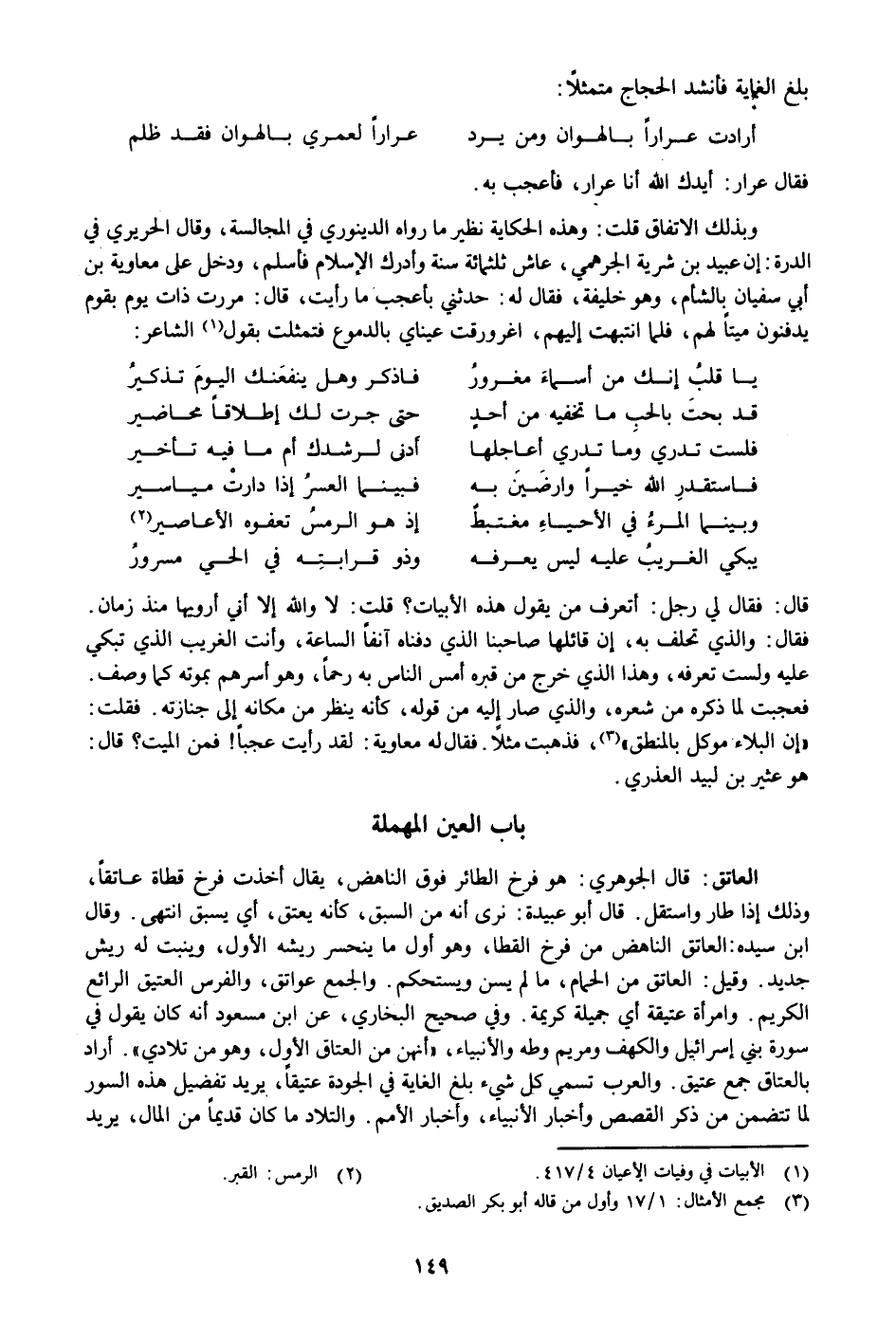 وبذلك الاتفاق قلت: وهذه الحكاية نظير ما رواه الدينوري في المجالسة، وقال الحريري في الدرة: إن عبيد بن شرية الجرهمي، عاش ثلاثمائة سنة وأدرك الإسلام فأسلم، ودخل على معاوية بن أبي سفيان بالشأم، وهو خليفة، فقال له: حدثني بأعجب ما رأيت، قال: مررت ذات يوم بقوم يدفنون ميتا لهم، فلما انتبهت إليهم، اغرورقت عيناي بالدموع فتمثلت بقول «1» الشاعر: