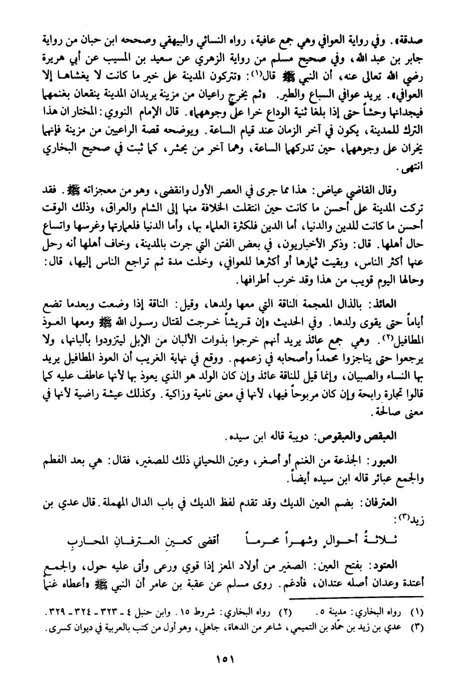 صدقة» . وفي رواية العوافي وهي جمع عافية، رواه النسائي والبيهقي وصححه ابن حبان من رواية جابر بن عبد الله، وفي صحيح مسلم من رواية الزهري عن سعيد بن المسيب عن أبي هريرة رضي الله تعالى عنه، أن النبي صلى الله عليه وسلم قال «1» : «تتركون المدينة على خير ما كانت لا يغشاها إلا العوافي» . يريد عوافي السباع والطير. «ثم يخرج راعيان من مزينة يريدان المدينة ينقعان بغنمهما فيجدانها وحشا حتى إذا بلغا ثنية الوداع خرا على وجوههما» . قال الإمام النووي: المختار ان هذا الترك للمدينة، يكون في آخر الزمان عند قيام الساعة. ويوضحه قصة الراعيين من مزينة فإنهما يخران على وجوههما، حين تدركهما الساعة، وهما آخر من يحشر، كما ثبت في صحيح البخاري انتهى.