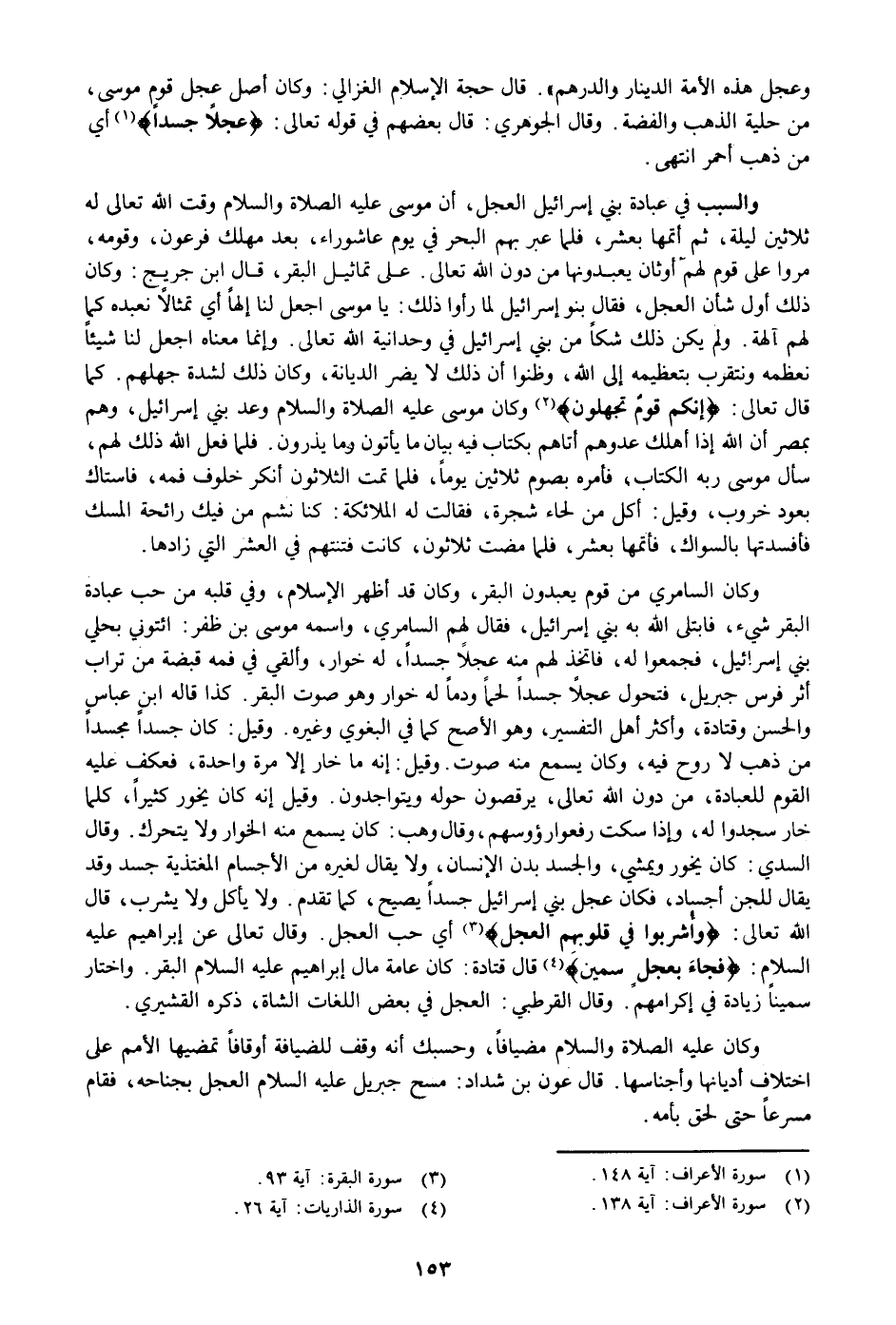 وعجل هذه الأمة الدينار والدرهم» . قال حجة الإسلام الغزالي: وكان أصل عجل قوم موسى، من حلية الذهب والفضة. وقال الجوهري: قال بعضهم في قوله تعالى: عِجْلًا جَسَداً*