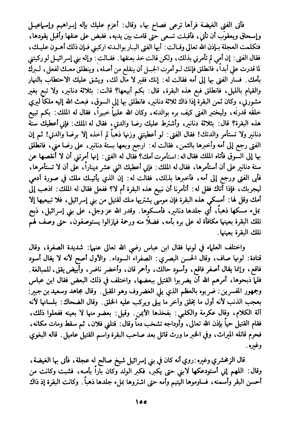 فأتى الفتى الغيضة فرآها ترعى فصاح بها، وقال: أعزم عليك بإله إبراهيم وإسماعيل وإسحاق ويعقوب أن تأتي، فأقبلت تسعى حتى قامت بين يديه، فقبض على عنقها وأقبل يقودها، فتكلمت العجلة بإذن الله تعالى وقالت: أيها الفتى البار بوالدته اركبني فإن ذلك أهون عليك، فقال الفتى: إن أمي لم تأمرني بذلك، ولكن قالت خذ بعنقها. فقالت: وإله بني إسرائيل لو ركبتني لما قدرت علي أبدا، فانطلق فإنك لو أمرت الجبل أن ينقلع من أصله، وينطلق معك لفعل، لبرك بأمك. فسار الفتى بها إلى أمه فقالت له: إنك فقير لا مال لك، ويشق عليك الاحتطاب بالنهار والقيام بالليل، فانطلق فبع هذه البقرة، قال: بكم أبيعها؟ قالت: بثلاثة دنانير، ولا تبع بغير مشورتي، وكان ثمن البقرة إذا ذاك ثلاثة دنانير، فانطلق بها إلى السوق، فبعث الله إليه ملكا ليري خلقه قدرته، وليختبر الفتى كيف بره بوالدته، وكان الله عليما خبيرا، فقال له الملك: بكم تبيع هذه البقرة؟ قال: بثلاثة دنانير، وأشترط عليك رضا والدتي، فقال له الملك: فإني أعطيك ستة دنانير ولا تستأمر والدتك! فقال الفتى: لو أعطيتني وزنها ذهبا لم آخذه إلا برضا والدتي! ثم إن الفتى رجع إلى أمه وأخبرها بالثمن، فقالت له: ارجع وبعها بستة دنانير، على رضا مني، فانطلق بها إلى السوق فأتاه الملك فقال له: استأمرت أمك؟ فقال له الفتى: إنها أمرتني أن لا أنقصها عن ستة دنانير على أن أستأمرها، فقال له الملك: فإني أعطيك اثني عشر دينارا، على أن لا تستأمرها، فأبى الفتى ورجع إلى أمه، فأخبرها بذلك، فقالت له: إن الذي يأتيك ملك في صورة آدمي ليجربك، فإذا أتاك فقل له: أتأمرنا أن نبيع هذه البقرة أم لا؟ ففعل فقال له الملك: اذهب إلى أمك وقل لها: أمسكي هذه البقرة فإن موسى يشتريها منك لقتيل من بني إسرائيل، فلا تبيعيها إلا بملء مسكها ذهبا، أي جلدها دنانير، فأمسكوها. وقدر الله عز وجل، على بني إسرائيل، ذبح تلك البقرة بعينها مكافأة له على بره بأمه، فضلا منه ورحمة فما زالوا يستوصفون، حتى وصف لهم تلك البقرة بعينها.
