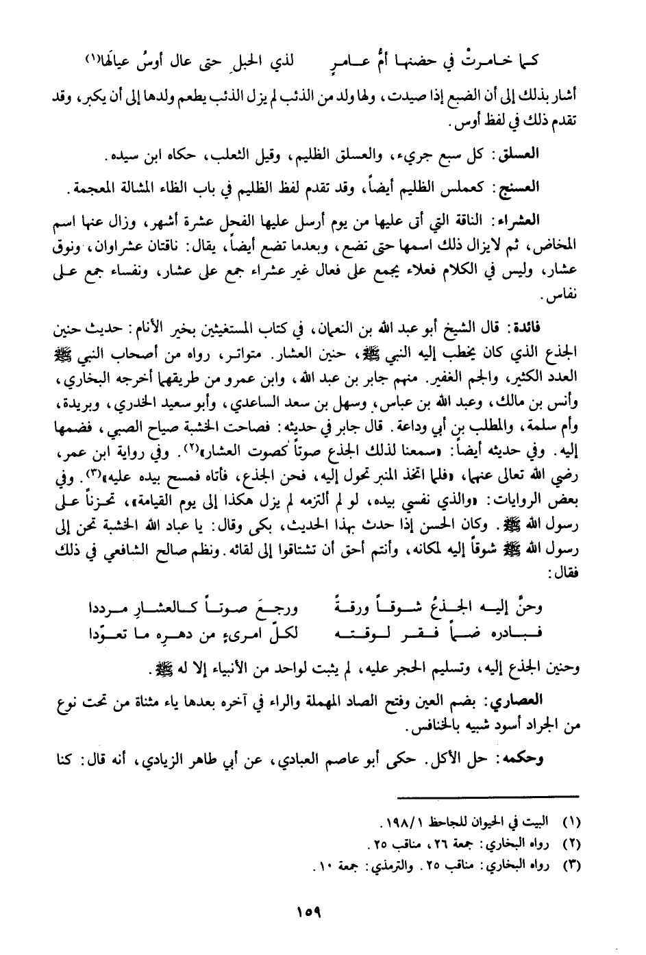 وحنّ إليه الجذع شوقا ورقة ... ورجع صوتا كالعشار مرددا