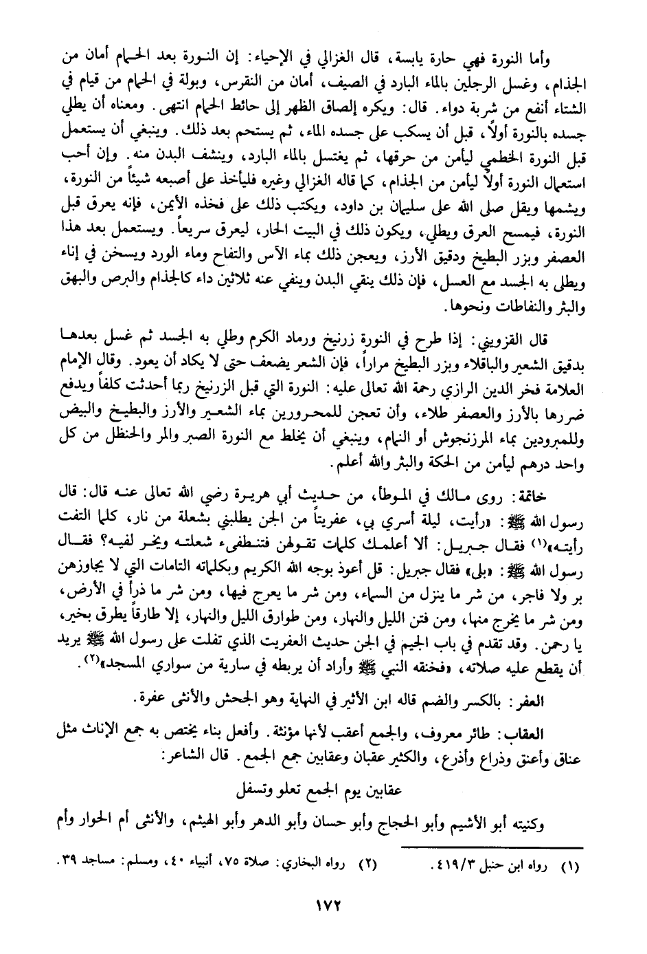 وأما النورة فهي حارة يابسة، قال الغزالي في الإحياء: إن النورة بعد الحمام أمان من الجذام، وغسل الرجلين بالماء البارد في الصيف، أمان من النقرس، وبولة في الحمام من قيام في الشتاء أنفع من شربة دواء. قال: ويكره إلصاق الظهر إلى حائط الحمام انتهى. ومعناه أن يطلي جسده بالنورة أولا، قبل أن يسكب على جسده الماء، ثم يستحم بعد ذلك. وينبغي أن يستعمل قبل النورة الخطمي ليأمن من حرقها، ثم يغتسل بالماء البارد، وينشف البدن منه. وإن أحب استعمال النورة أولا ليأمن من الجذام، كما قاله الغزالي وغيره فليأخذ على أصبعه شيئا من النورة، ويشمها ويقل صلى الله على سليمان بن داود، ويكتب ذلك على فخذه الأيمن، فإنه يعرق قبل النورة، فيمسح العرق ويطلي، ويكون ذلك في البيت الحار، ليعرق سريعا. ويستعمل بعد هذا العصفر وبزر البطيخ ودقيق الأرز، ويعجن ذلك بماء الآس والتفاح وماء الورد ويسخن في إناء ويطلى به الجسد مع العسل، فإن ذلك ينقي البدن وينفي عنه ثلاثين داء كالجذام والبرص والبهق والبثر والنفاطات ونحوها.