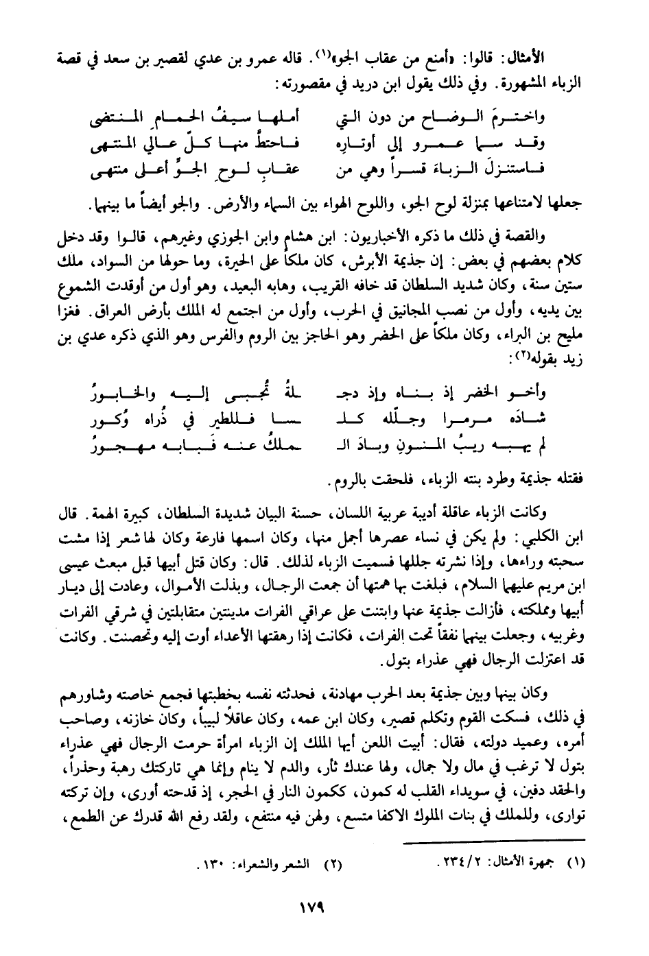 والقصة في ذلك ما ذكره الأخباريون: ابن هشام وابن الجوزي وغيرهم، قالوا وقد دخل كلام بعضهم في بعض: إن جذيمة الأبرش، كان ملكا على الحيرة، وما حولها من السواد، ملك ستين سنة، وكان شديد السلطان قد خافه القريب، وهابه البعيد، وهو أول من أوقدت الشموع بين يديه، وأول من نصب المجانيق في الحرب، وأول من اجتمع له الملك بأرض العراق. فغزا مليح بن البراء، وكان ملكا على الحضر وهو الحاجز بين الروم والفرس وهو الذي ذكره عدي بن زيد بقوله «2» :